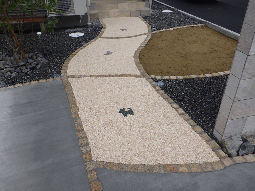 先日据え付けたプラーガブリックにジョイサンドハード(固まる珪砂)を入れて道路際を仕上げて車の乗り入れが出来るようになりました。土間スリットのファイバーレジンとアプローチのリンクストーンも硬化が確認が出来たのでバリケードを開放しました。リンクストーン内に埋め込んだ犬をかたどったワンポイントも綺麗に仕上がり、お客様にも喜んでいただきました。残工事に植栽が残っているのでもう少しで完了になります。冬場から着工させていただき春先までコンクリート打設をお待ちいただいてようやく竣工になります。お客様にも車両の移動等ご協力いただきありがとうございました。