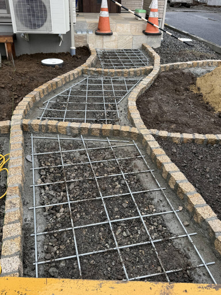 写真はありませんが、別の現場で五号砕石や植栽周りの整地、門柱周りの植栽、ファイバーレジン、全体の水洗いを行いました。少し残り作業はありますが、ほぼ仕上げの現場だったため、作業のやり残し、道具の置忘れなどに気を付けました。ファイバーレジンはやり残しで残っていた部分だけでしたが、周りに散らかさないように打設をしました。最後に植栽と浅間石、土間などの水洗いを全体に行い、ファイバーレジン周りにバリケードを設置して、現場を離れました。