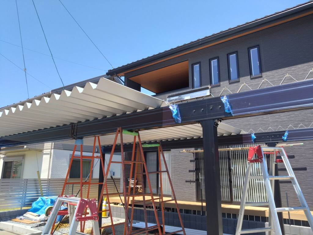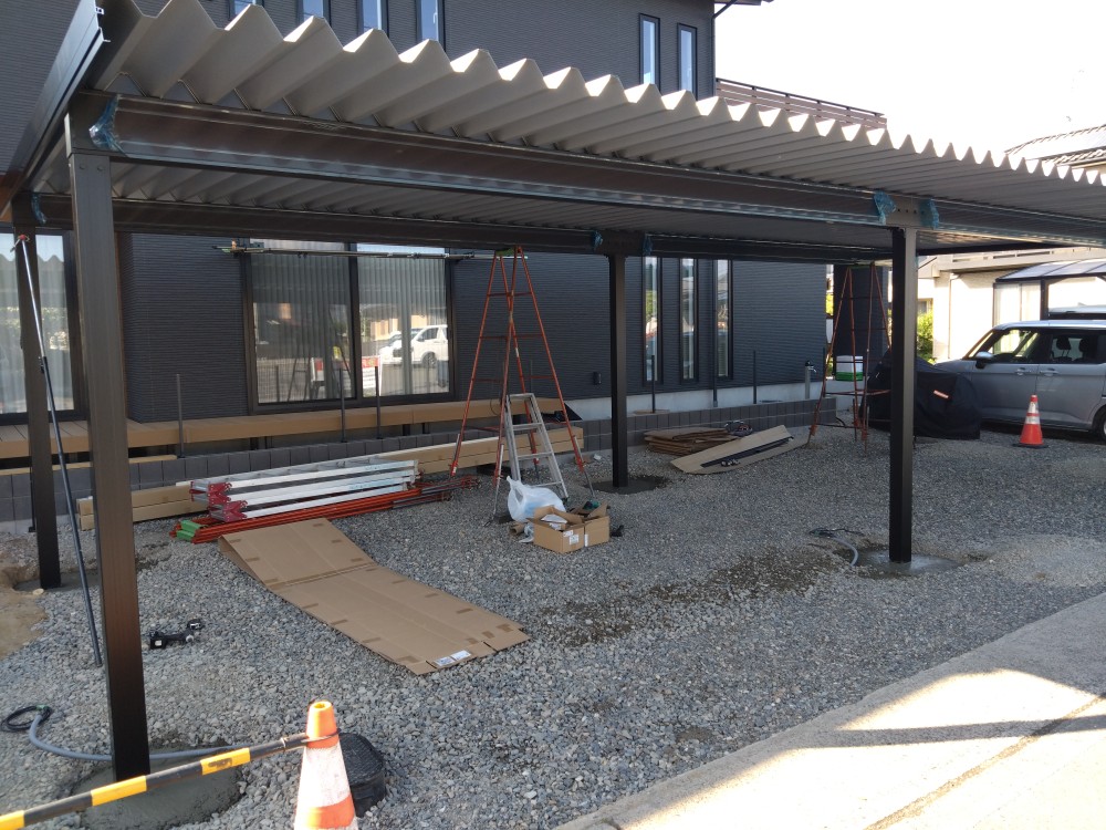 こちらの現場では、カーポート柱ベース打設とライトの配線作業を行いました。ベースを水平にならし柱を置けば高さが出るようにならしていきます。水平じゃないと柱を置いたときに傾いてしまい屋根材がうまくはまらなかったりしてしまうのでしっかり均していきます。ライトの配線ではトランスに線をつなぐときに+-を間違わないようにつないでいきます。間違えてしまうとライトがつかなくなってしまいます。