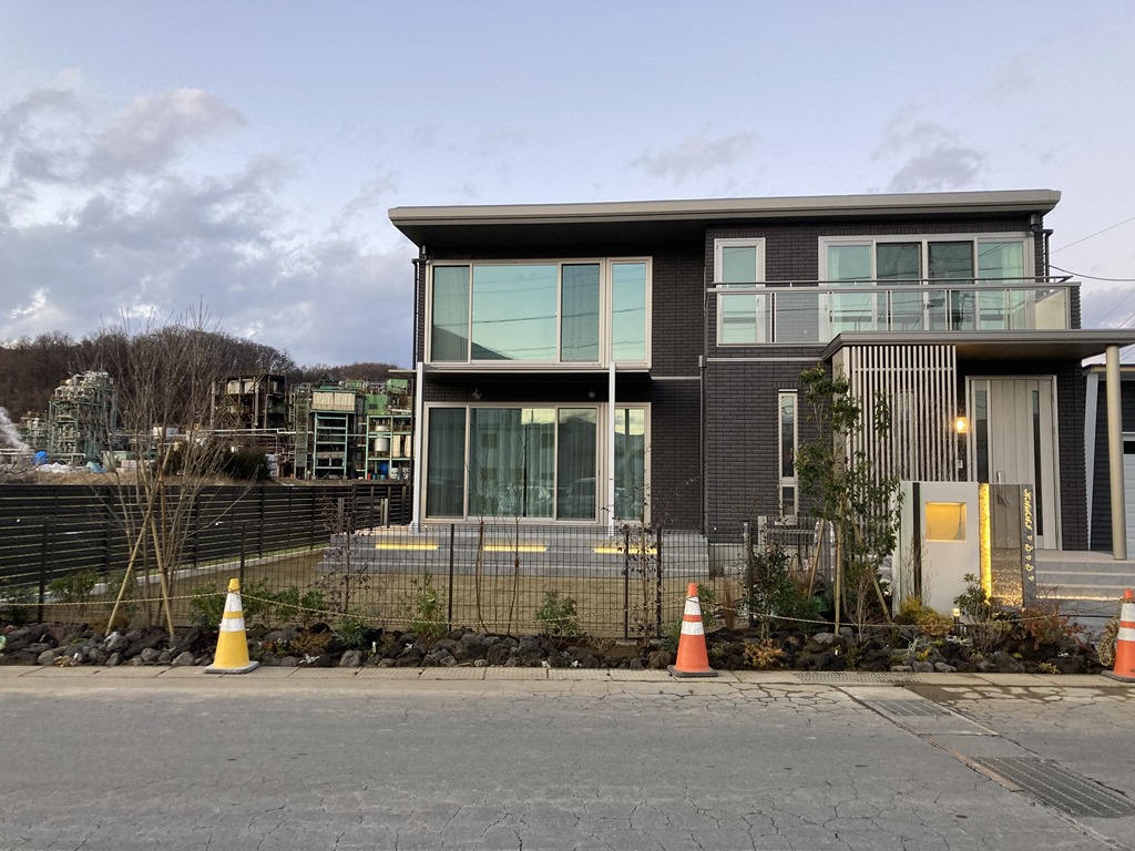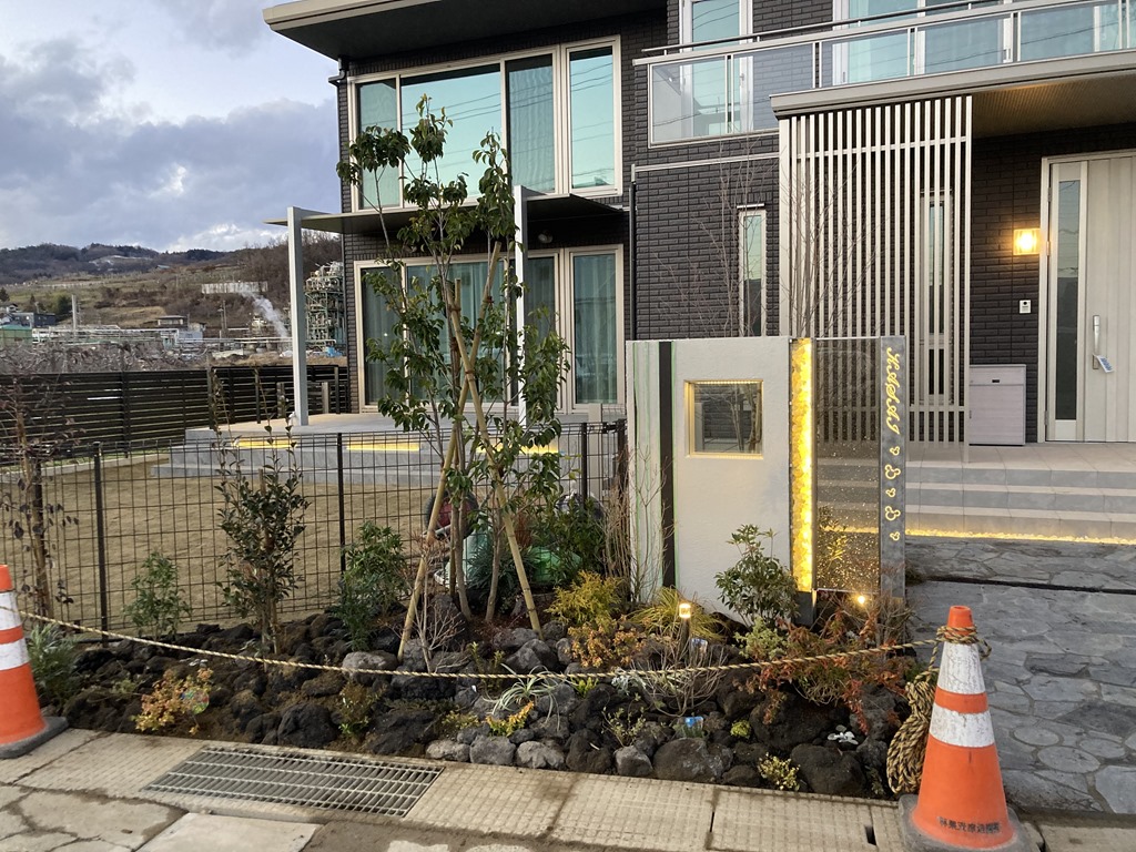 門柱前に植栽をしてGフレームにダウンライトを取り付け、最後に掃除をしてこちらのお宅も今日で完成です!