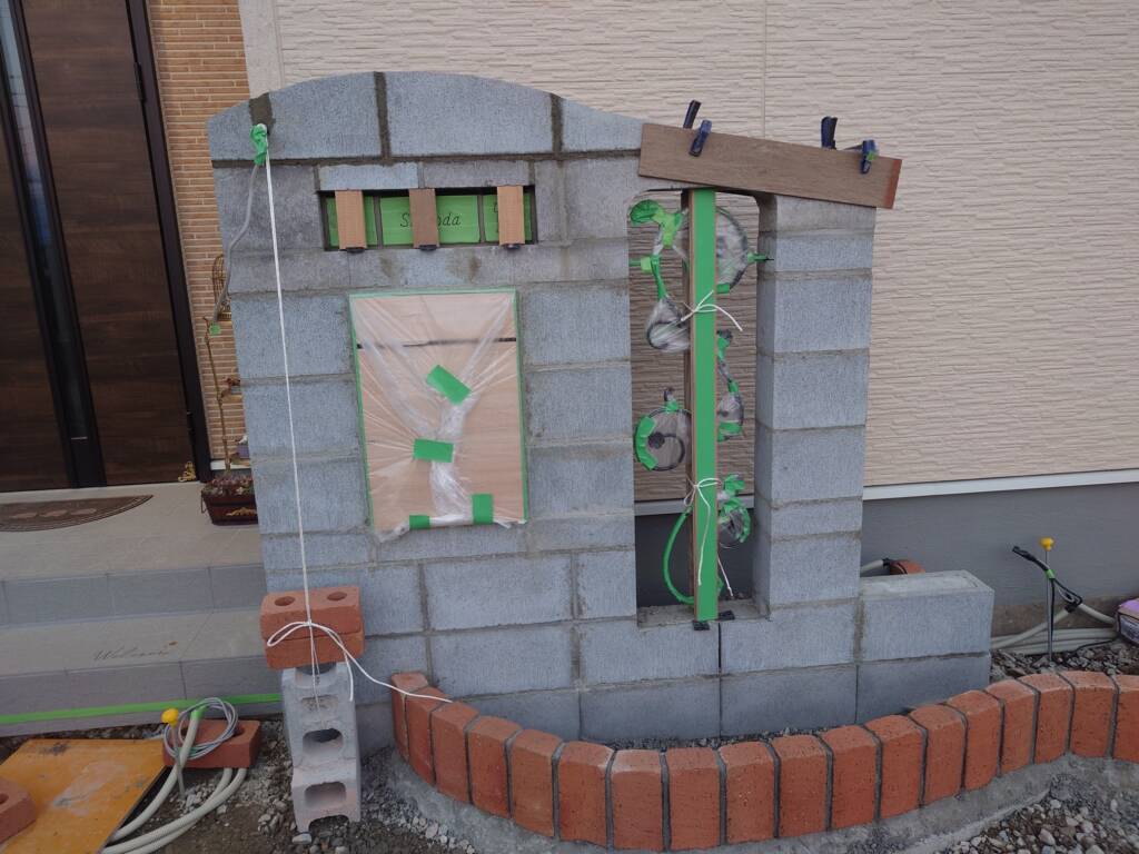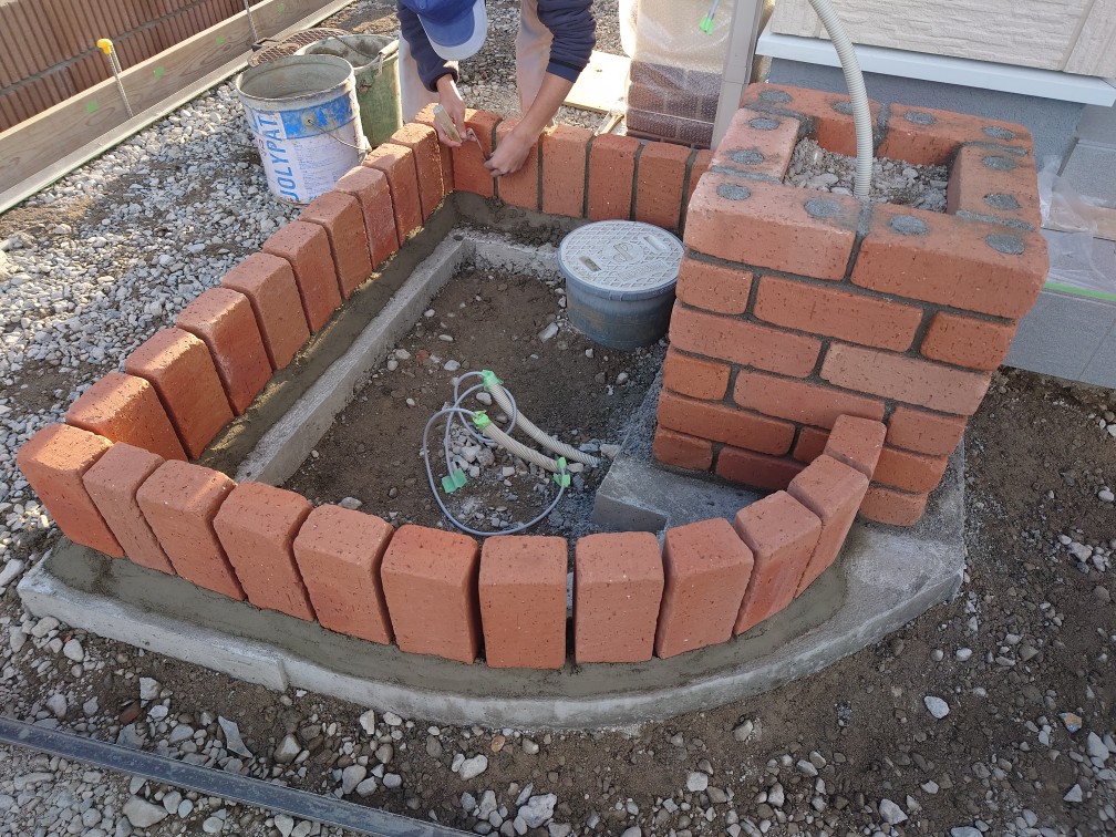 門柱、レンガ 11月11日(火) こちらの現場では、門柱のブロック積みで天端のカーブする箇所を積んでいきました。この上にソイルレンガペティートという商品を並べて据えていきます。こちらの現場では、全体的にオレンジのレンガやブロック使っていて洋風な外壁ととてもよくあっていてかっこいいです!