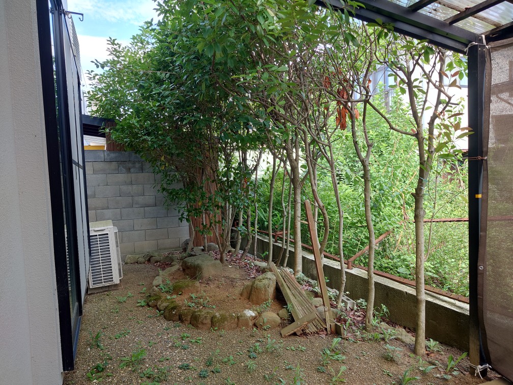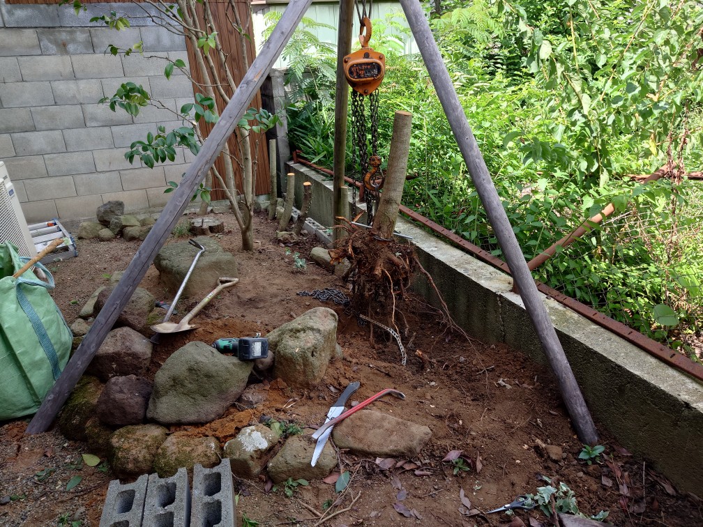 今日は、こちらの現場で伐採と伐根を行いました。今樹木が並んでいる部分にフェンスを施工するため、二枚目の写真で残っているツバキ以外は伐採になります。ある程度上からのこで切っていき、細かくしながら片づけます。切り株の状態にしたら、チェーンブロックと呼ばれる道具で根っこごと引き抜きます。今回使ったのは小さめのチェーンブロックで、滑車の原理を利用して、重いものをクレーンのように引き上げることができます。この現場のように、狭くて重機やクレーンが入れない現場で、重い石材を動かしたり、今回のように伐根に使ったりしています。三本の丸太を支柱にして使うので、柱の位置と間隔をバランスよく設置しなければなりませんが、軽い力でも作業が出来るため、とても便利な道具です。
