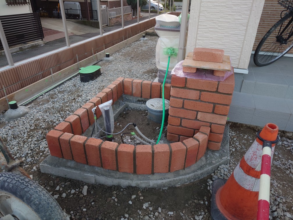 土間配筋、サイコロ レンガ積み、目地入れ 10月29日(水) 今日は、こちらの現場で土間の配筋とサイコロ入れ、玄関前のレンガ積みと目地入れを行いました。土間の打設は明日なので、シュートの運び入れと雨水マスのテープ養生も行いました。普段の鉄筋とは違い、この現場ではワイヤーメッシュを使用するので、上を歩いても歪みのないようにサイコロを設置しました。 こちらは、玄関前のレンガ積みになります。写真右の角柱の上には、球状のライトがくるので、中に配線を通してあります。レンガは、ブロックよりも水を吸いやすく汚れやすいので、目地入れの際には、こまめに水洗いをしながら作業を進めました。