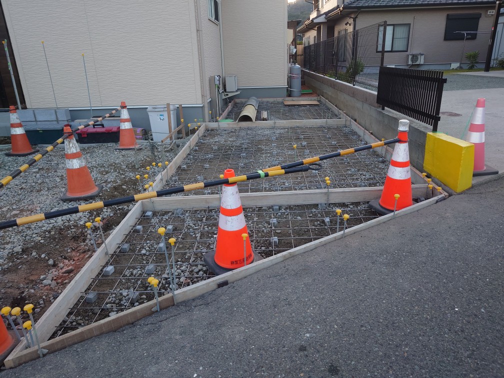玄関アプローチ下地 こちらの現場は玄関アプローチ下地を施工しました。下地には亜鉛メッキ鉄筋、スーパー目地を使用してコンクリートを打設しますが、今回はスタンプコンクリート仕上げになります。スタンプコンクリートとは、コンクリートの表面に模様となる型を押し付け、着色を施すことで、自然石やレンガ、タイル、木目調といった他の素材そっくりに仕上げる工法です。今回は着色なしで仕上げになります。 スーパー目地は土間コンクリートの伸縮に優れた緩衝材で、目地に入れるとクラック防止になります。 長野市 松本市 塩尻市 エクステリア