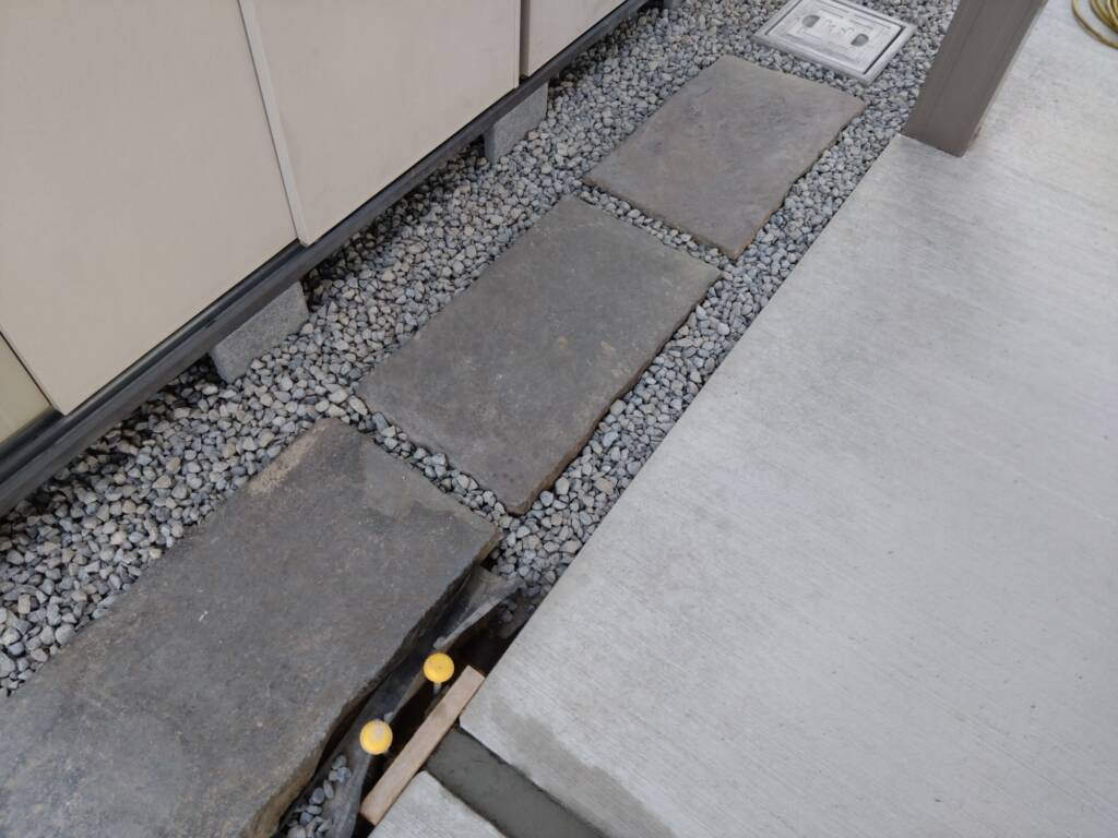 別の現場ではアプローチ脇の緑化ブロックの加工、据え付けを行い門柱となるディーズガーデンのアルモスリムを立てました。車庫側では1台用のカーポートのエフルージュの組み立てをしました。カラーはホワイトになり、レンガ目地や天然石目地のホワイトと合わせ一体感を生みます。