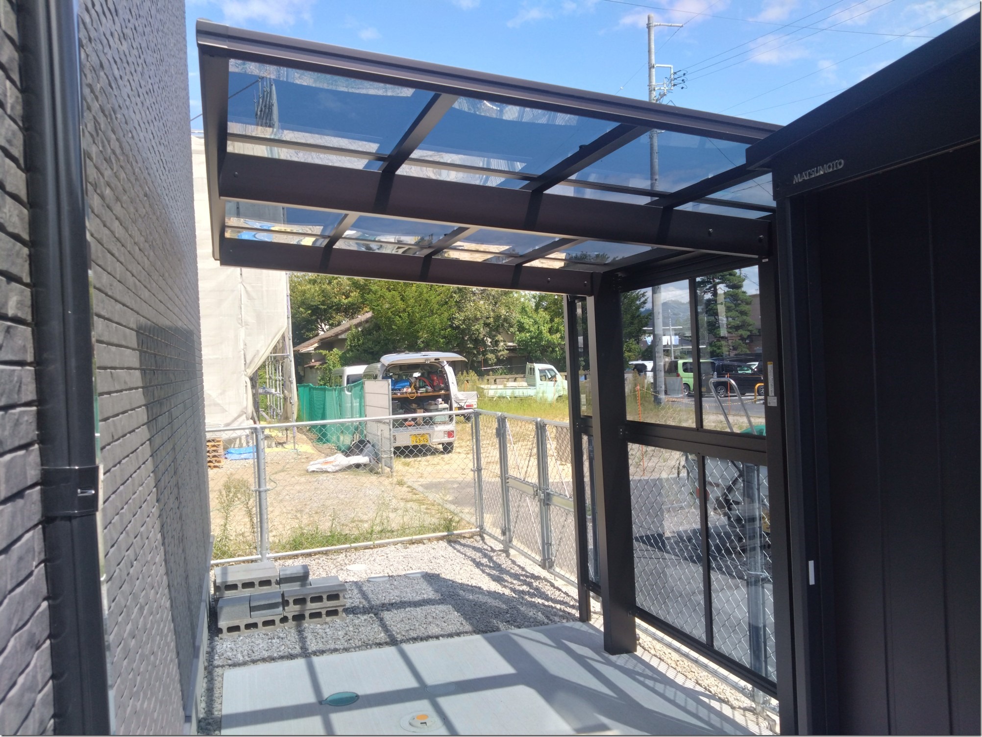 二枚目の写真は、パティオムーヴとブロック積みの囲い壁になります。屋根がブラインドのようになっていて、ハンドルを回すと開けられるようになっています。囲いの壁はジョリパットで仕上げてあります。三か所にスクリーンブロックが埋め込み、内側はベンチになっています。
