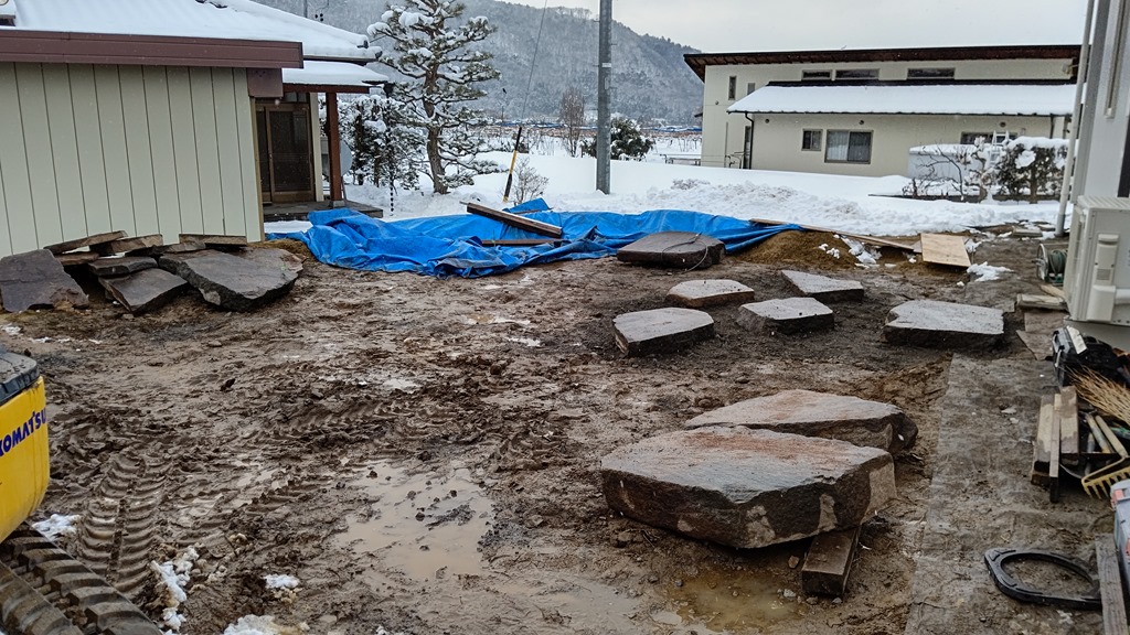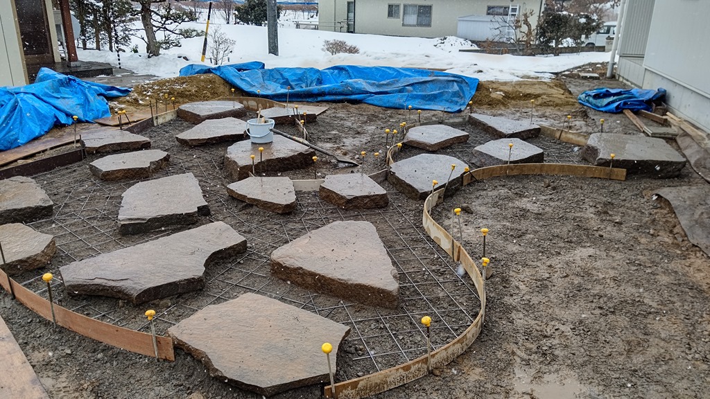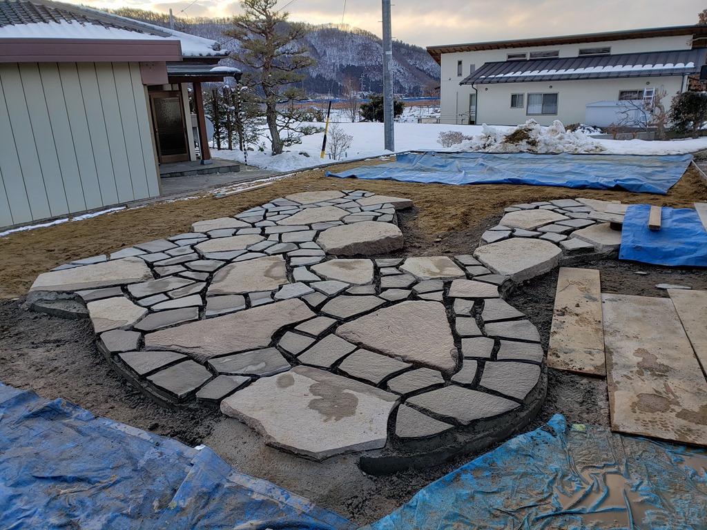 真冬の作業であったため、くちゃくちゃと雪を除雪しながらの作業。鉄平石の大判をバランスよく振り分けながら据え付け…