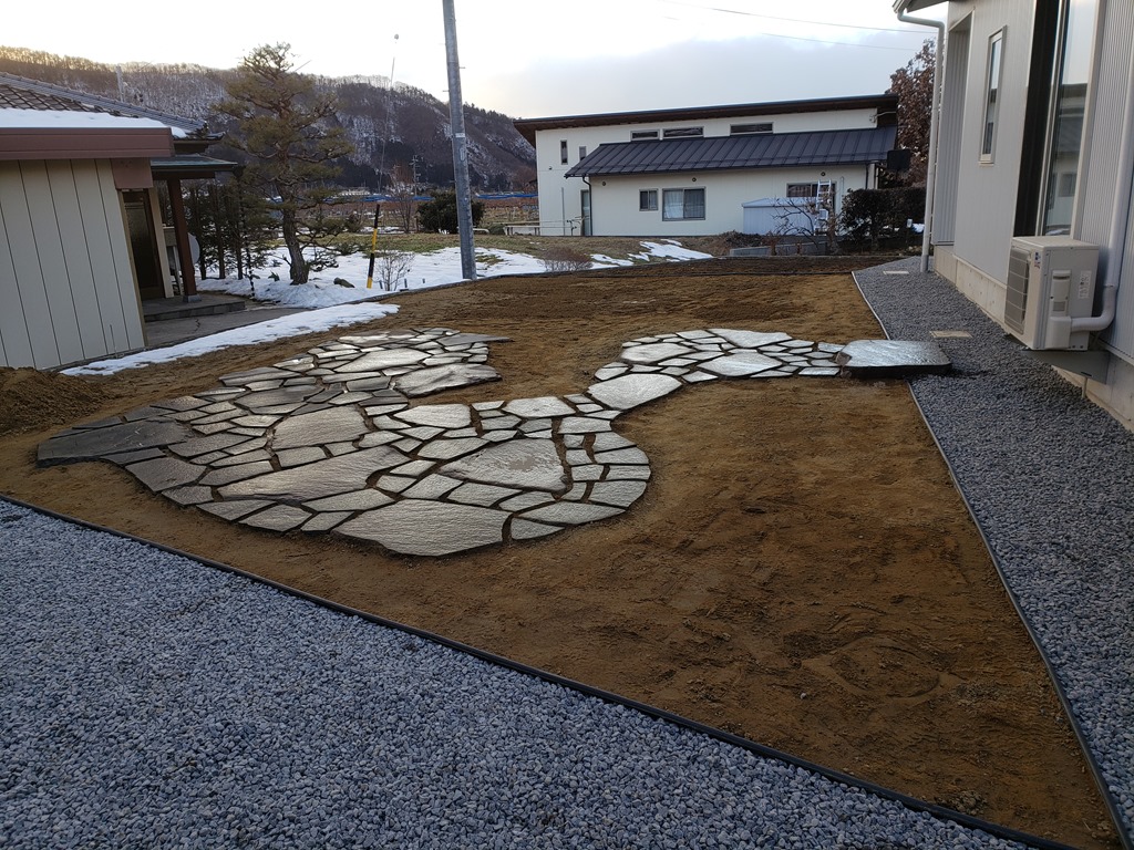 2022年4月21日 5号砕石、スキ土・残土処理、外構工事、天然石貼り、完成、客土入れ替え、長野市、高麗芝 toledo