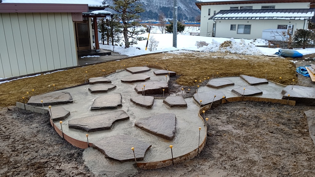 コンクリート養生を終え、通常の大きさの鉄平石張り、目地は芝となるため、少し広めに…