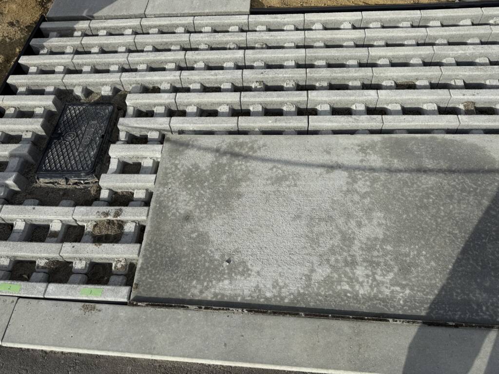 こちらの現場では、緑化ブロックの据え付け、浅間石を入れていく作業を行いました。緑化ブロックは間に浅間砂利という浅間石の砂利バージョンのものを入れていきます。緑化ブロックは以前打った土間と板石の天端と同じ高さになるように砂で高さを調整しながら据え付けていきます。据え付けられたら周りをモルタルで固定します。次に浅間石を入れる作業では石と石の隙間があまりできないように置いていきます。石と石を重ねるように置いていくことで隙間をなくしていきます。それでも隙間がなくならない場合は小さい浅間石を隙間に入れていきなくしていきます。浅間石を入れるだけでだいぶ印象が変わります。明日残りの浅間石を入れていく予定です。