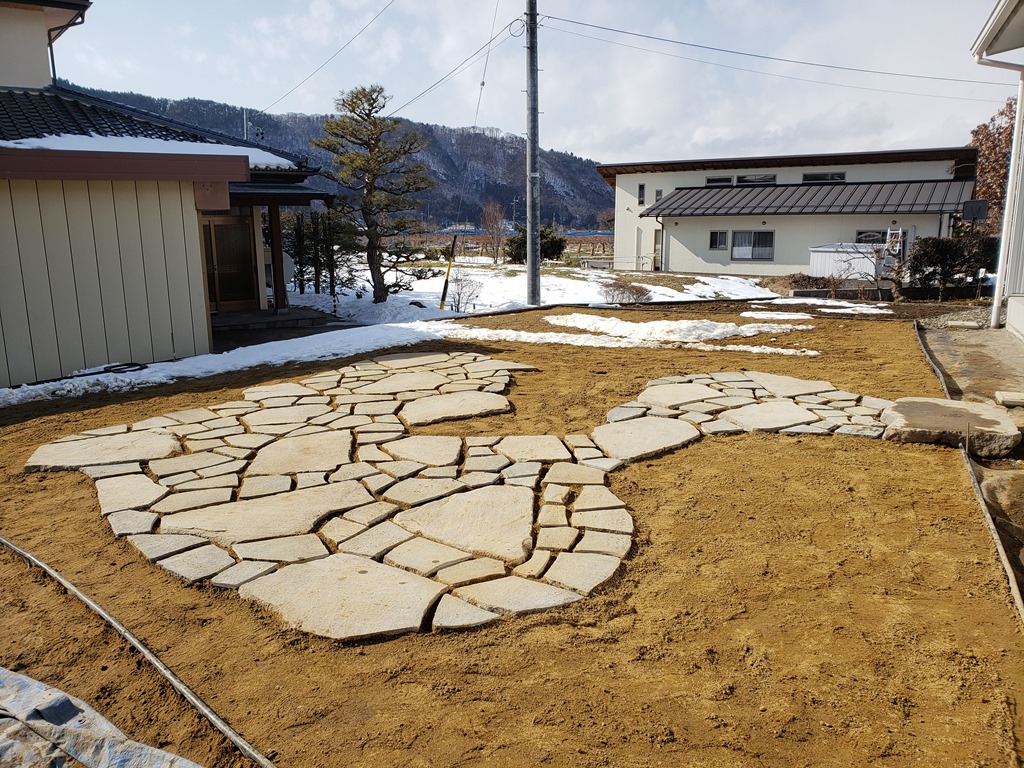 大判の鉄平石と通常の鉄平石の組み合わせの庭の中のテラス。山砂を敷き均し春になると真っ青な芝生に変化します。