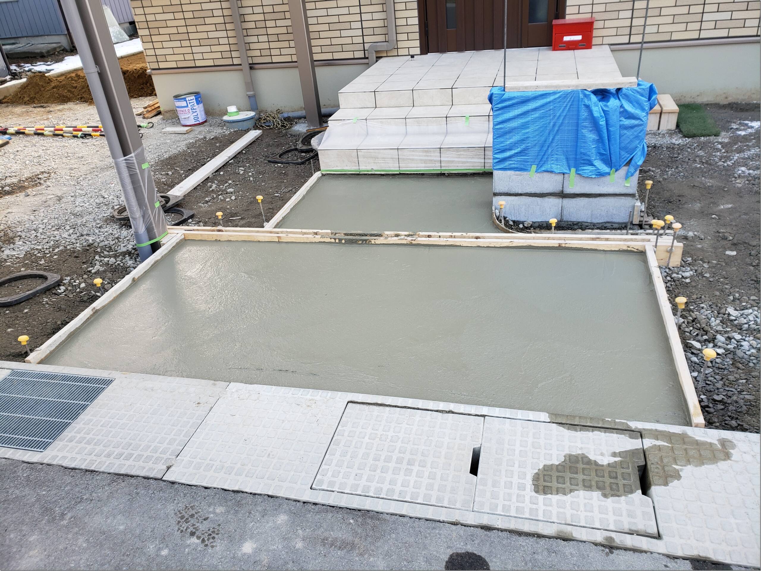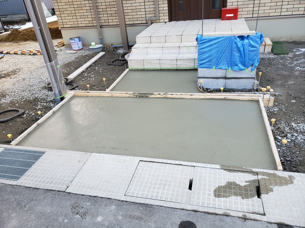 玄関前アプローチに天然石張りの基礎となるベースコンクリート打設をし、門柱ブロックを積み上げ中…