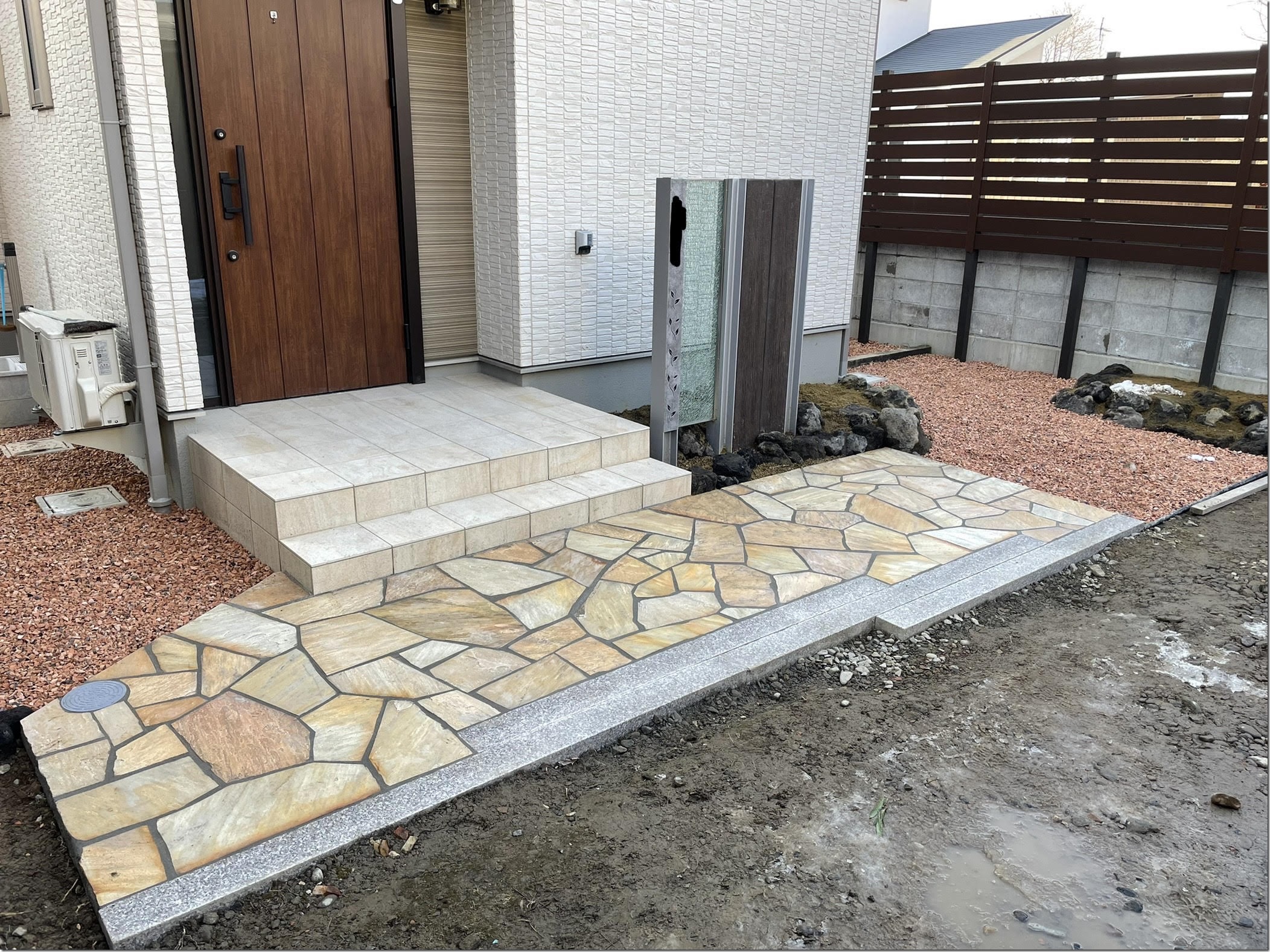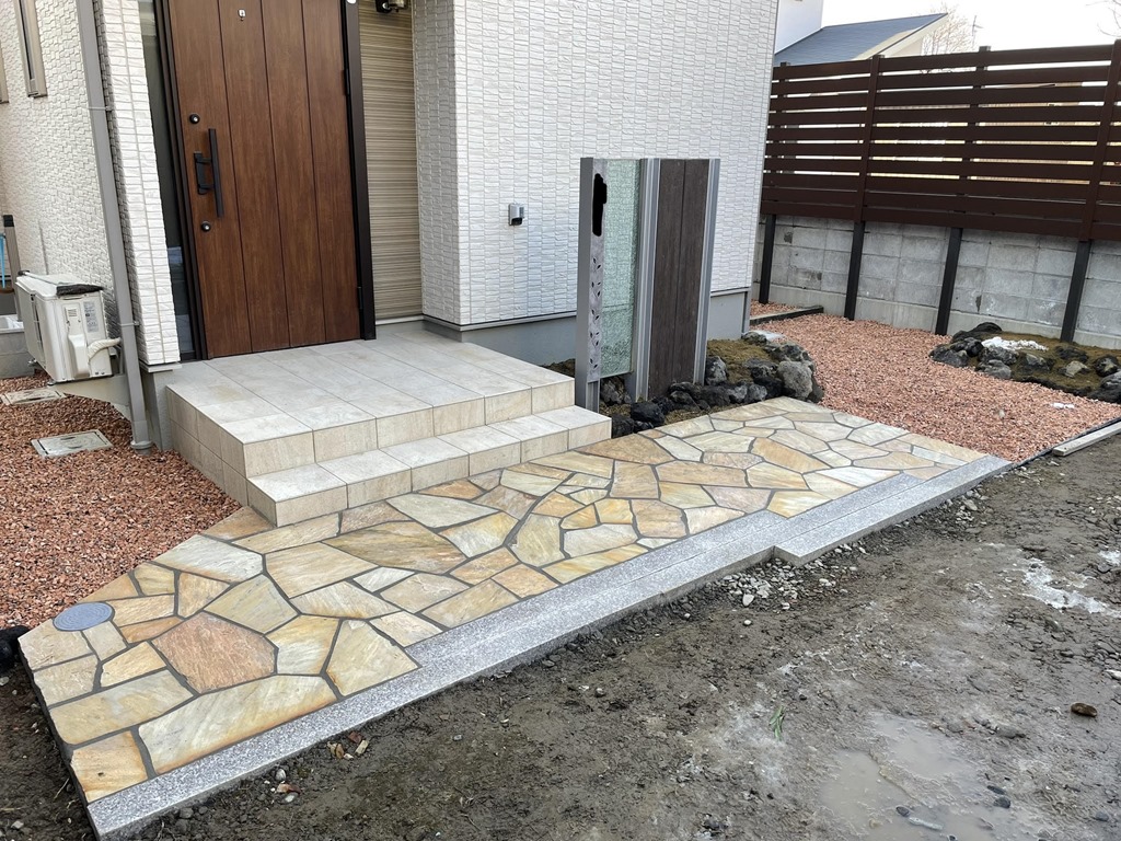 玄関前の乱形石貼り浅間石組みを終えて、周辺にテコラを敷き均しました。構造物周りに砂利を敷くことにより、泥はね防止と雑草対策にもなります。ときには、砂利の上を歩くとじゃりじゃりと…泥棒対策にも…