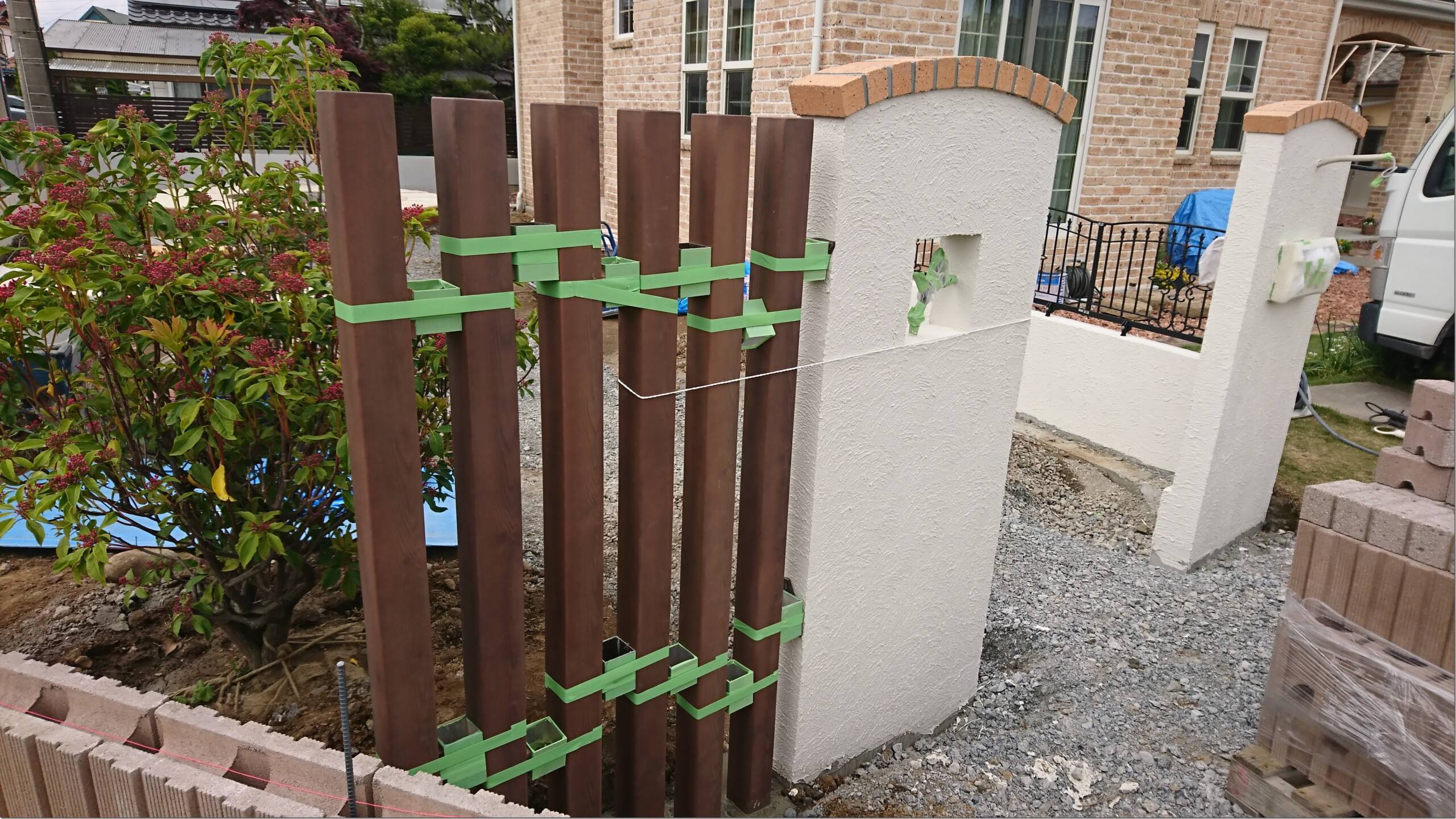 門柱横のティンバーの建て込みとブロック塀の塗りをしました。塗りの仕上げはラフ塗りになります。
