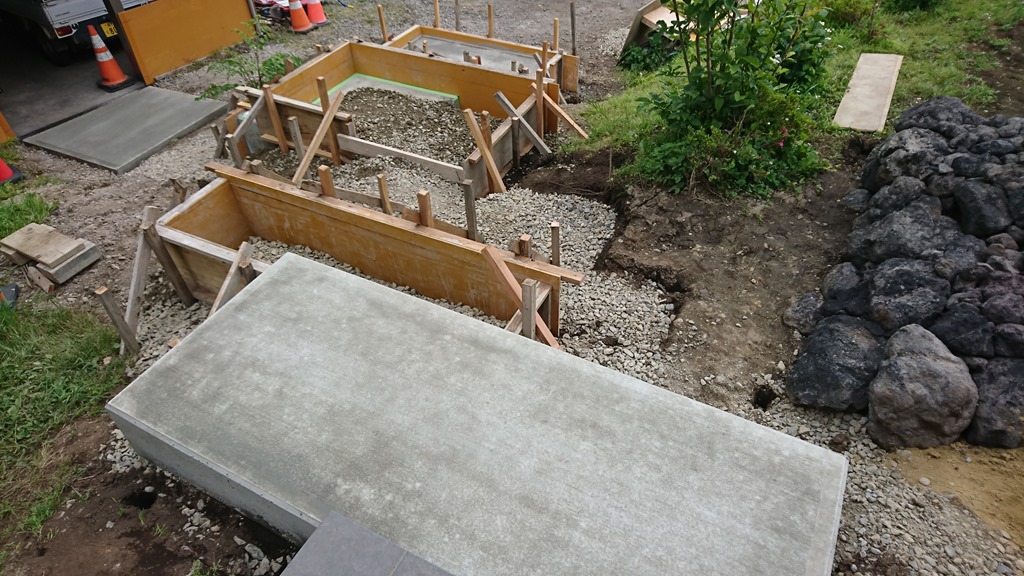 こちらの現場では枠組みの作業を行いました。階段になるので強度を高めるために、いつもより生コンを厚めに打ちます、生コンはとても重く、枠がしっかり固定されていないと簡単に外れて生コンが流れてしまうので写真のように杭を使い枠がびくともしないように固定していきます。手前はかかりますがとても大事な作業になります!