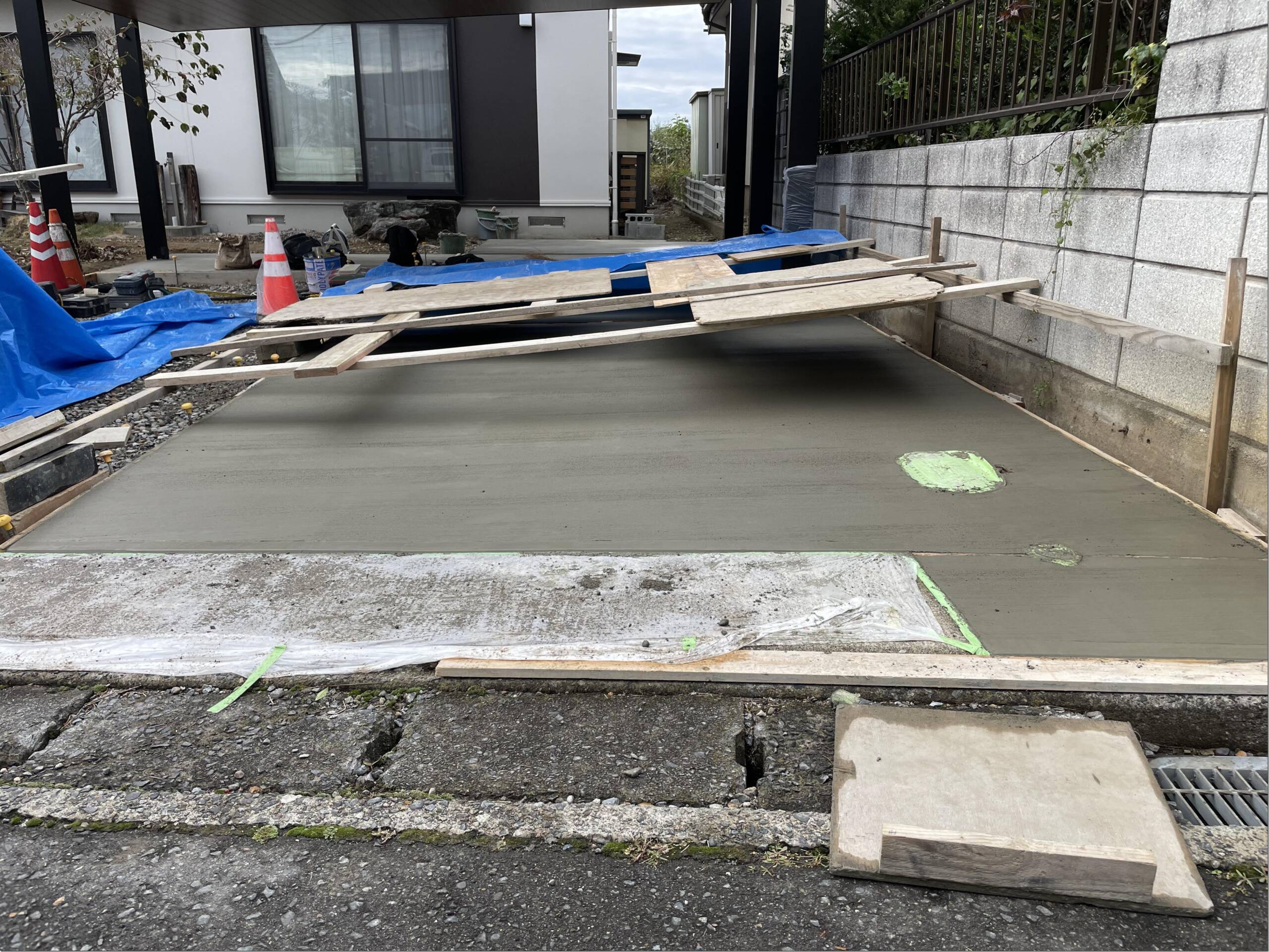 門柱横にティンバーを建て込み。インターロッキングブロックのリビオのベースコン打設。細いボーダー状のブロックを敷き詰めます。アプローチ目地は、ファイバーレジンの焼きさなげの色砂利。手前は客土を土壌改良し、奥はお客様施工の人工芝の下地の防草シート。