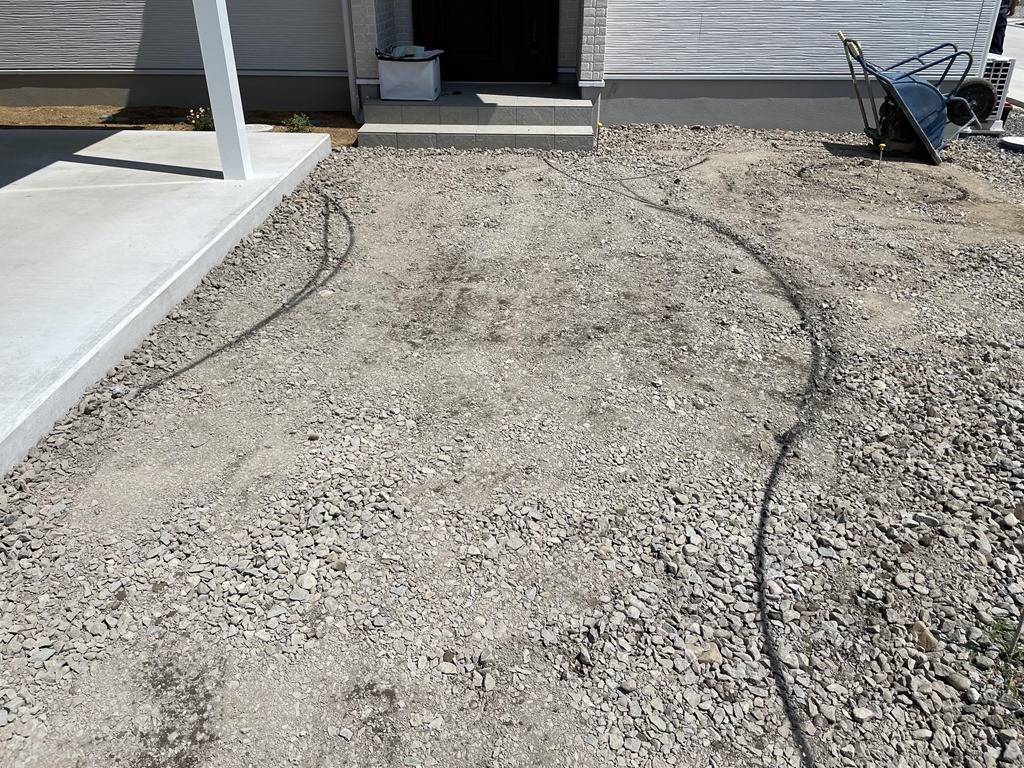 スキ土、アプローチ下地路盤 7月18日(火) こちらのお宅では、アプローチの路盤を作っていきました、黒いスプレーで印してあるところがアプローチ箇所になります。この現場ではアプローチに中に石貼りがあるので先に石貼りのベースを打設していきます。高さは横の土間に合わせるので使いやすいアプローチになります。 長野市 外構 エクステリア