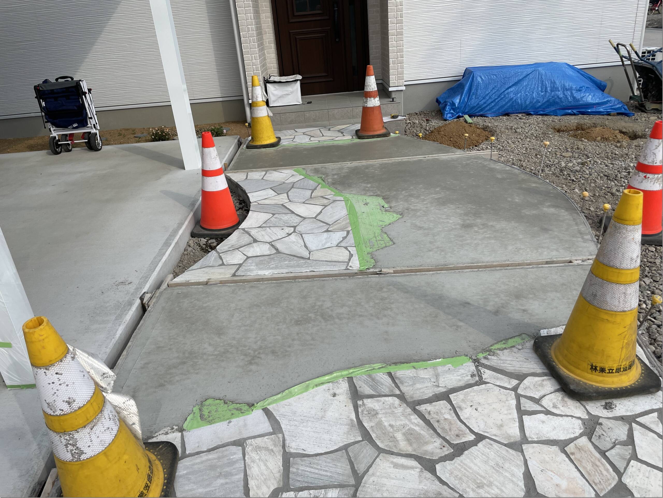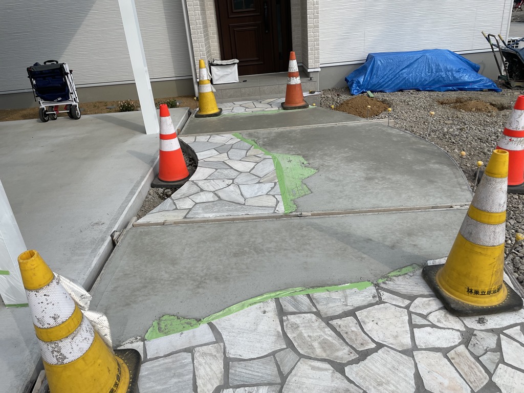 この現場では、アプローチが石貼りとコンクリートの組み合わせになるのでその打設です。写真でと見えないんですが表面刷毛引き仕上げです。カラーコーンが入っているくびれの部分が植栽帯になりスリットはテコラになります。