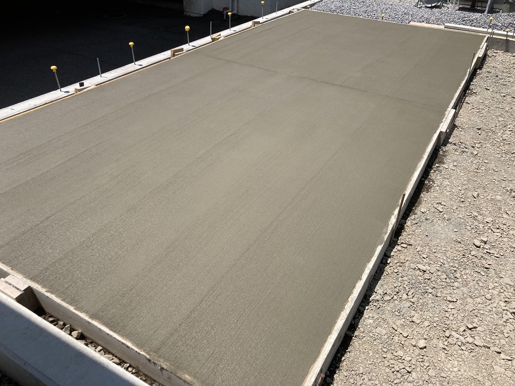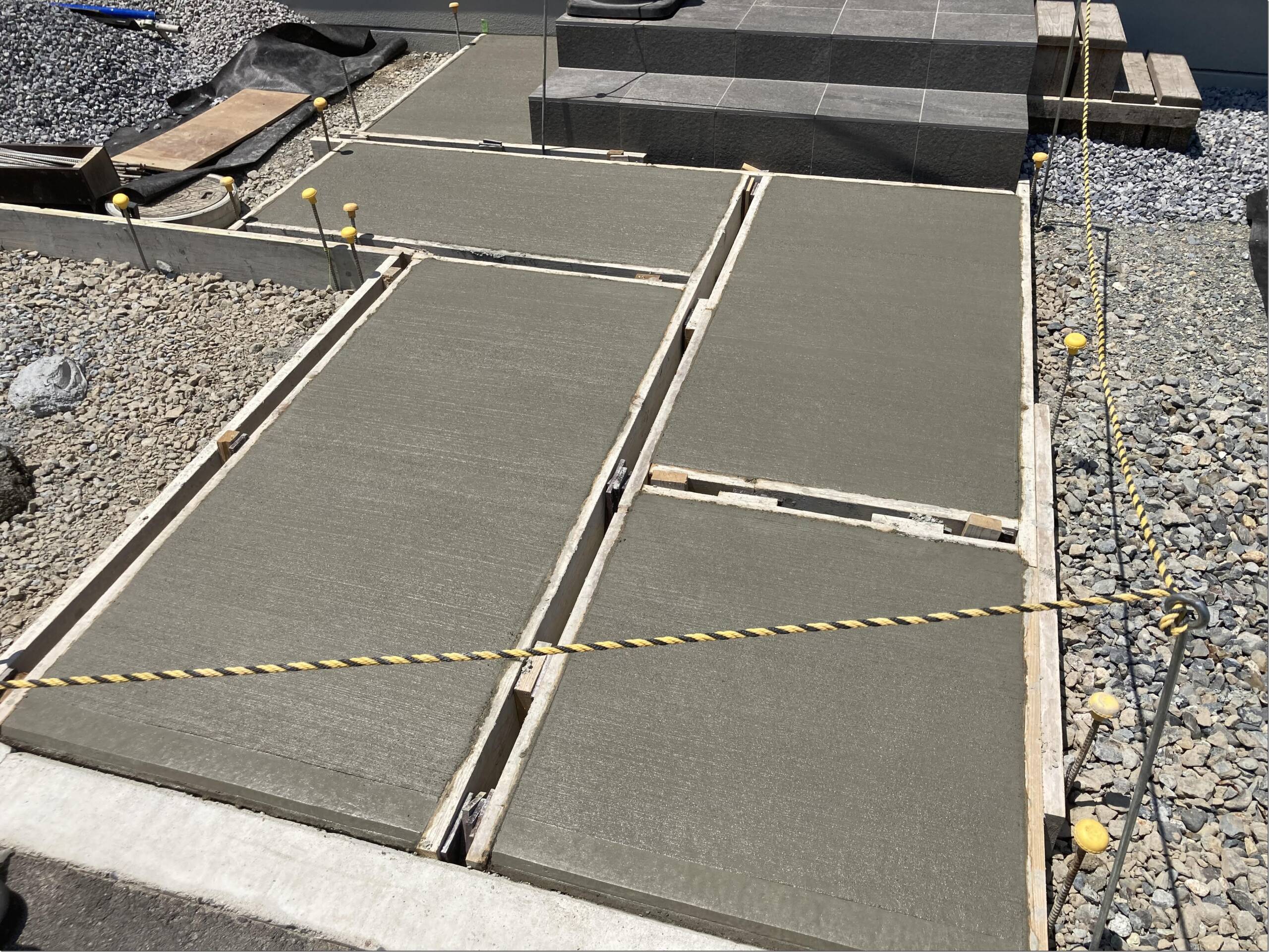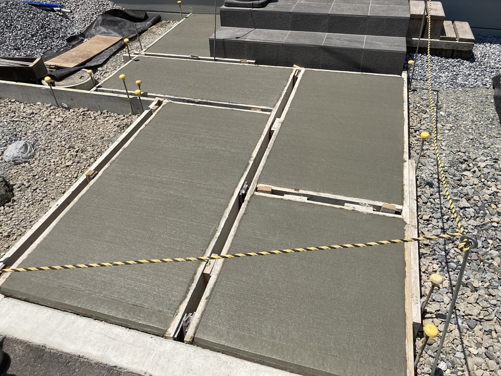 そんな梅雨明けての月曜日ですが二つの現場でコンクリート打設がありました。駐車場の打設とアプローチの打設をしました。下の駐車場ですが、いつものようなスリットではなく「エラスタイト」というクッション材で区切ってあります。土間の真ん中ぐらいに薄っすらと線がありますが、それがエラスタイトになります。