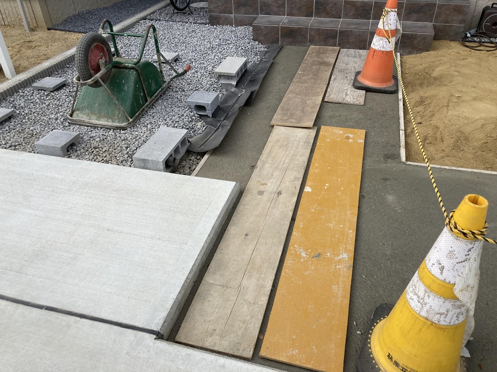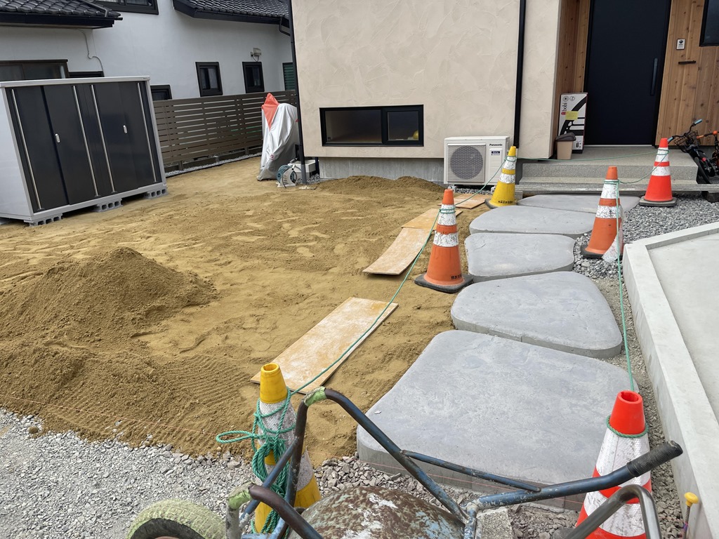 この現場では物置の土台と「パエリア」という美味しそうな名前の板石を並べるためのベースの打設をしました。パエリアは時々使いますがどういった仕上がりになるかお楽しみに!