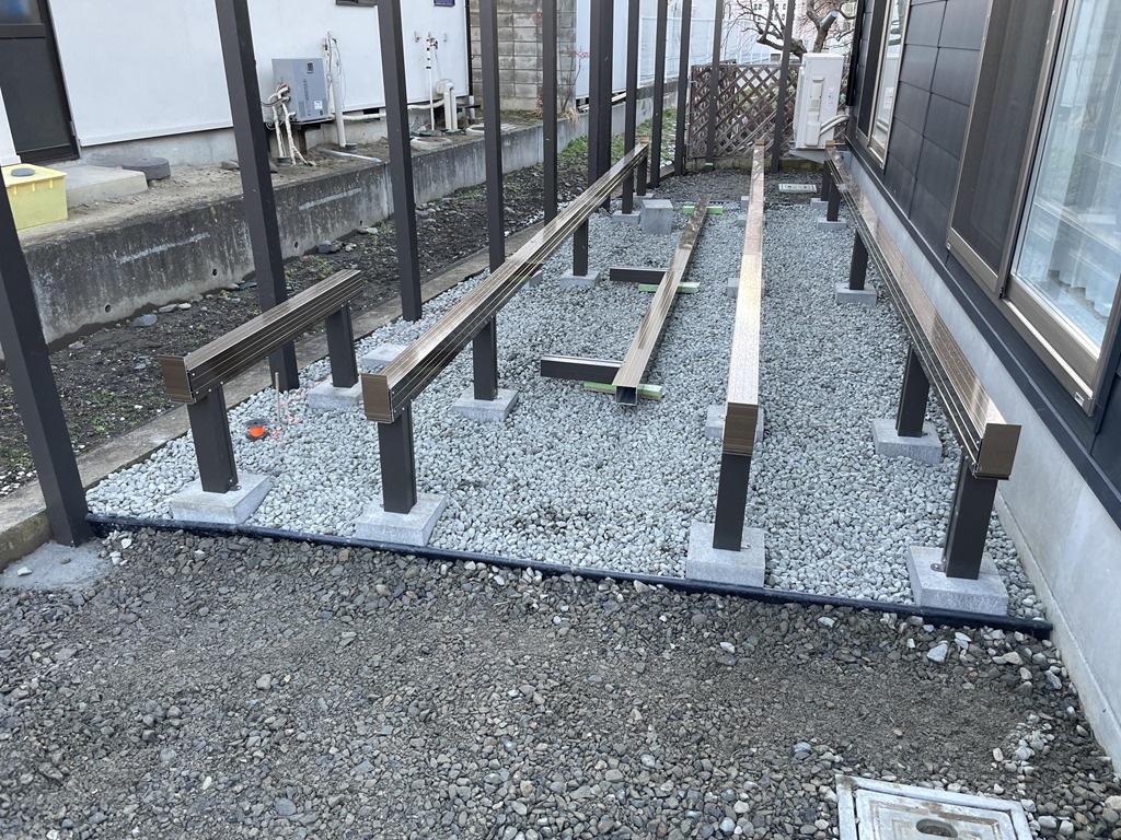 ウッドデッキ 2月27日(火) こちらのお宅ではウッドデッキの施工を行いました。この現場では境界に合わせて斜め加工がはいるので写真のように左側の大引を切ってあります。板も一枚一枚加工するので傷にならないよう慎重に作業していきます。 長野市 外構 エクステリア