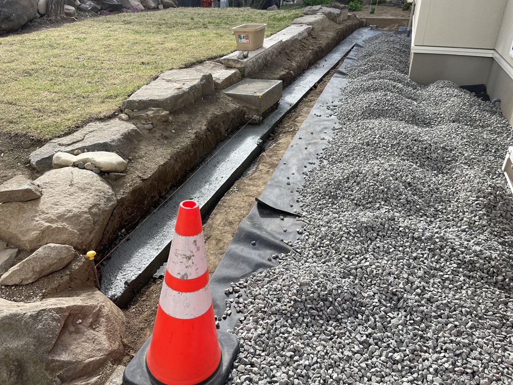 ベース打設、5号砕石 4月20日(土) お疲れ様です、トレド現場レポートです。今日も今日とて黄砂がひどい、個人的に花粉症みたく鼻が詰まる感じなので肉体労働者には特に辛く感じます。 そんな黄砂で悩まされる中、昨日型枠を組んだベースの鉄筋組みとコンクリートの打設、建物周りの5号砕石の配りまで作業しました。今回打設したベースには、一段上がった庭との段差がそれなりにあるので土留めを兼ねた縁石を並べていくことになります。 長野市 外構 エクステリア