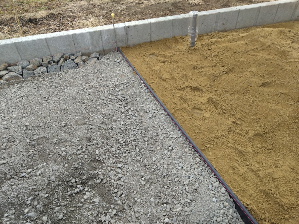 今日はこちらの現場で、門柱のブロック積みと縁思いの設置を行いました。門柱は、先日打設したベースの上にブロックを積んでいきます。インターホン用の配線も中に通す必要があるため、PF管に通したものを鉄筋に括り付け、根元のブロックに穴をあけて後ろに回しました。この門柱はガラスブロックも埋め込むため、加工に気を付けながら積んでいきます。最後に、山砂と砕石の境に縁思いを一か所設置して、門柱の養生をしてから作業を終えました。