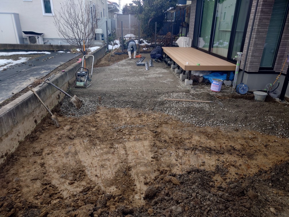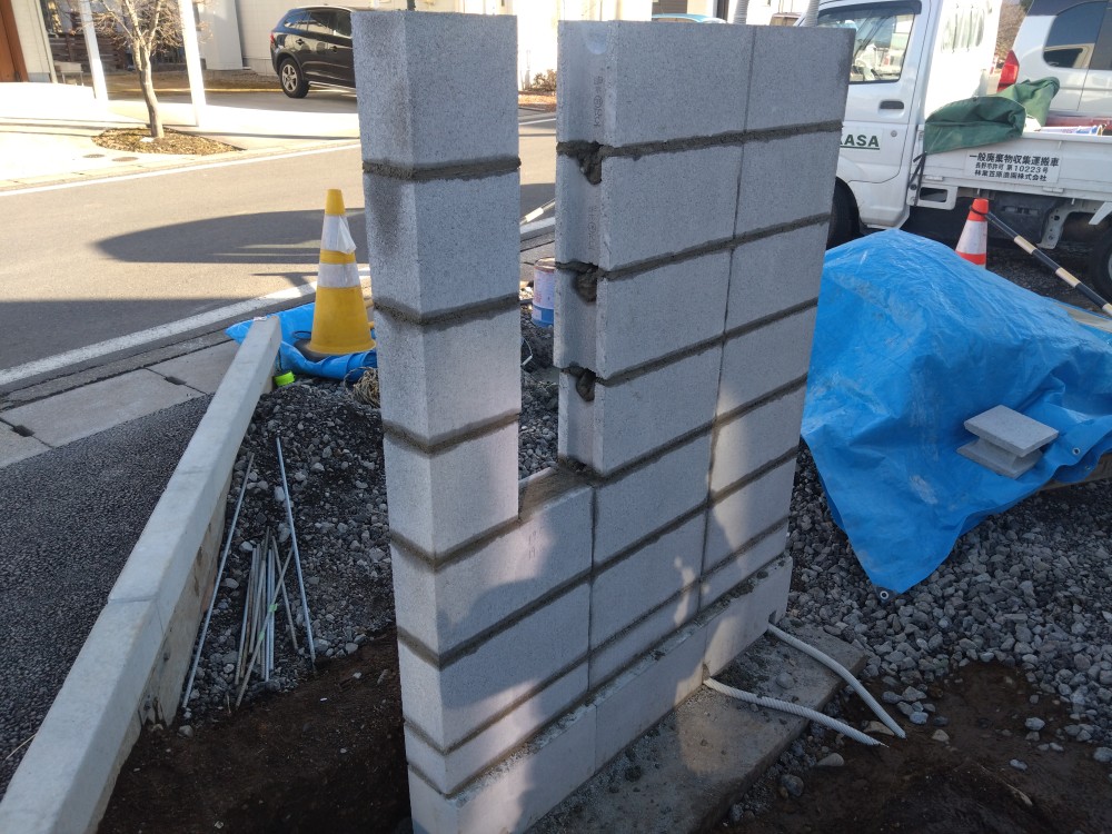 門柱…人工芝下地 2月13日(木) 門柱の下地ブロック積み。ブロック間の空間はガラスブロックが入り、おしゃれな門柱に変化していきます。 人工芝の下地砕石を敷き均し、転圧。人工芝ラインに仕切りの縁思いを設置し、くっきりとしたラインができあがります。手前は駐車場となるため、余分な土を剥ぎ取り砕石を搬入、敷き均し。ようやく庭の形が見えてきました。