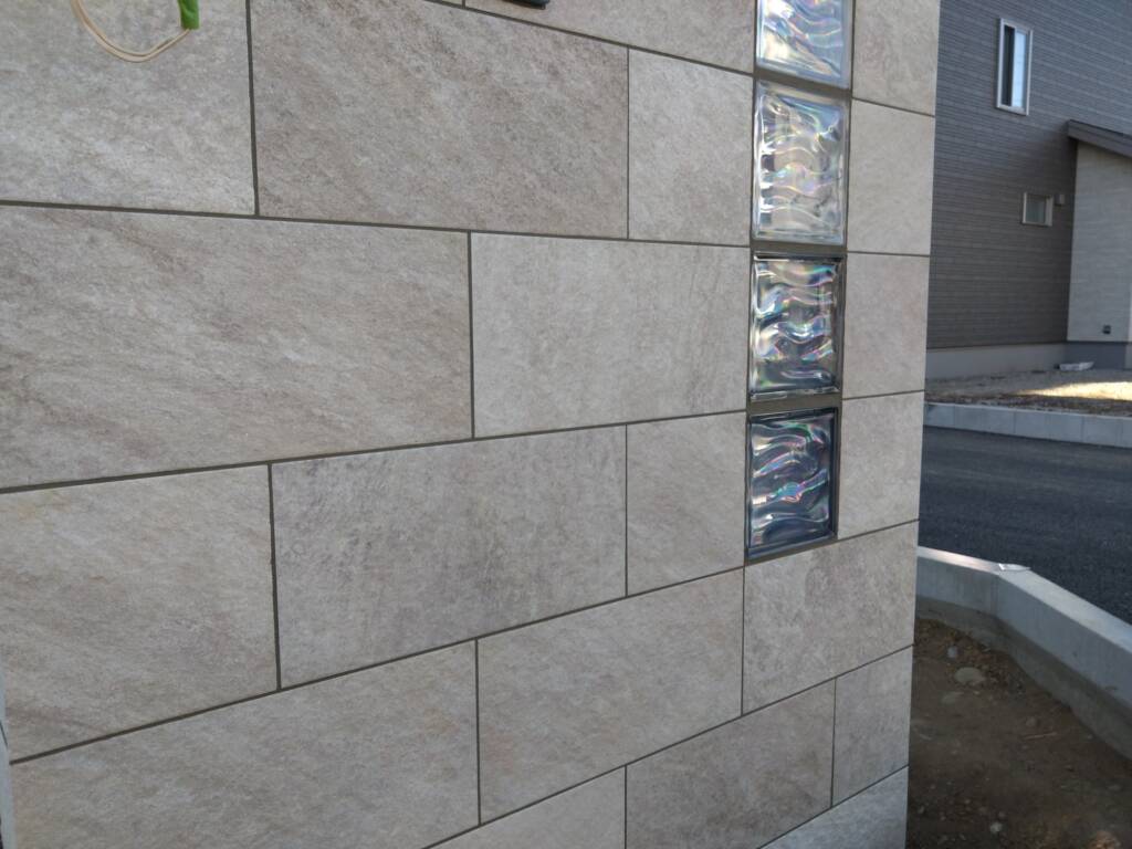こちらの現場では、門柱タイルの目地入れをしていきました。目地用セメントにも明るい色から暗い色まで種類がありタイルにあったセメントを使用していきます。門柱にガラス商品が入ると、とても高級感が増しますね!