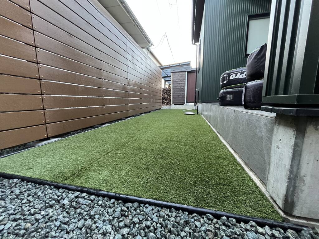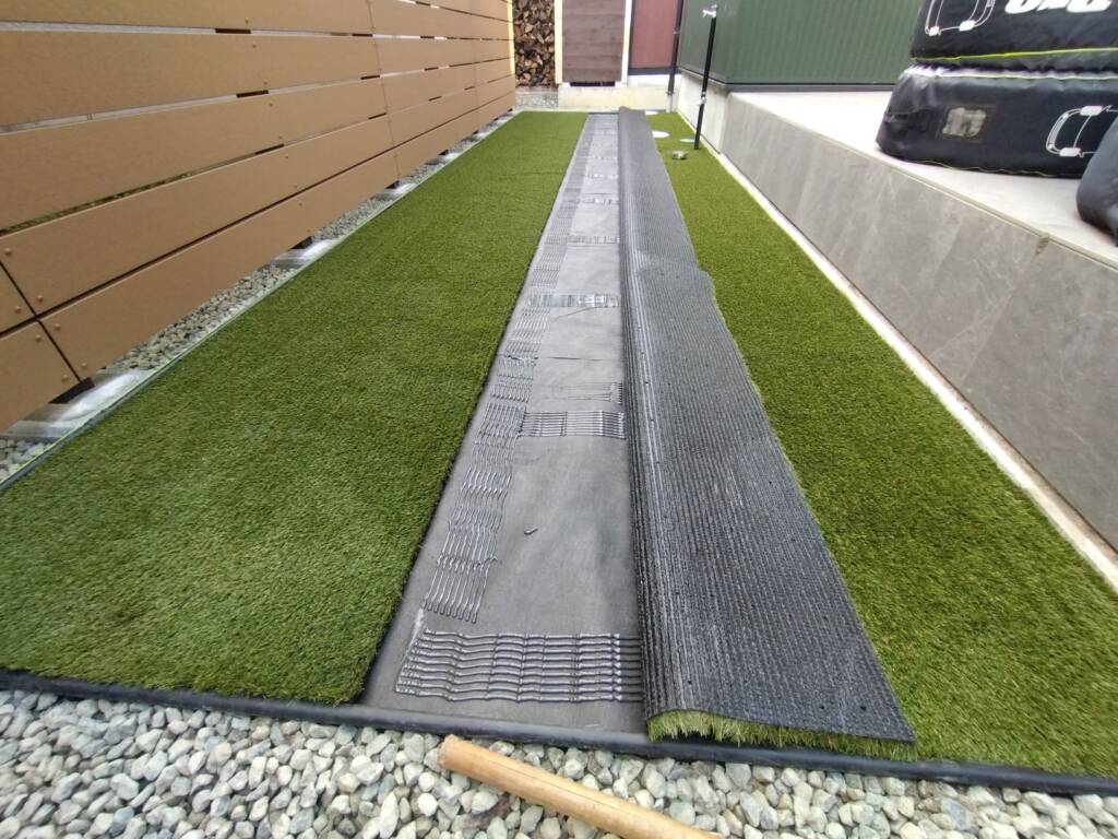 人工芝 貼り付け 12月10日(水) 今日は、こちらの現場で人工芝の貼り付けを行いました。前日に下地の均し、防草シートの敷きと固定、人工芝の加工までは進めていたので、今回は接着剤を使っての貼り付けを行いました。写真の真ん中に写っている防草シート上の線状のものが、塗布した接着剤になります。合わせ目や端から接着剤が溢れないように、少し余裕を持たせて塗ります。人工芝同士の合わせ目は目立ちやすいので、しっかりと貼り付けた後、合わせ目を整えて馴染ませます。