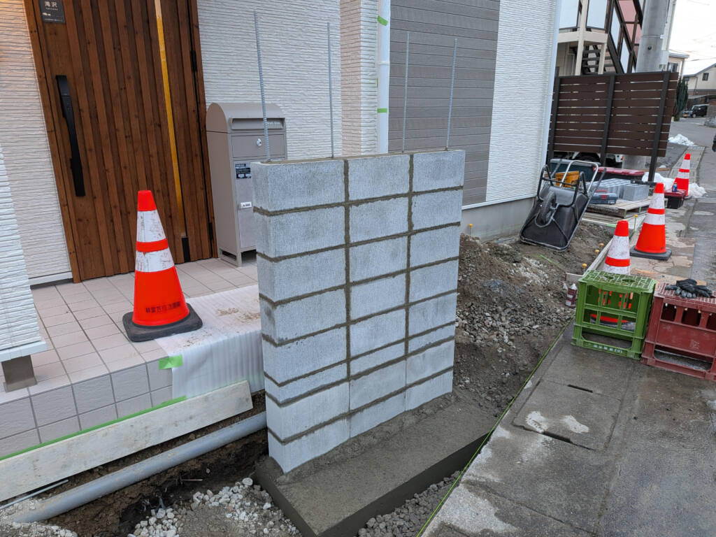 設計GLより、約60cmの深さまで余分な土を搬出し、砕石を頑丈に転圧を行い、L型に曲げた亜鉛メッキ鉄筋をブロック寸法に合わせ縦に配筋。基礎から天端まで、繫ぎがない1本物でベースコンクリートを打設。下の2段積みブロックは、基礎となる型枠ブロックのため周辺の仕上がり面からは見えなくなり、数十年先も傾きがないようしっかりと門柱を支えて行きます。それぞれの下地作業を行い、表札、笠木、ジョリパットのラフ仕上げとなります。