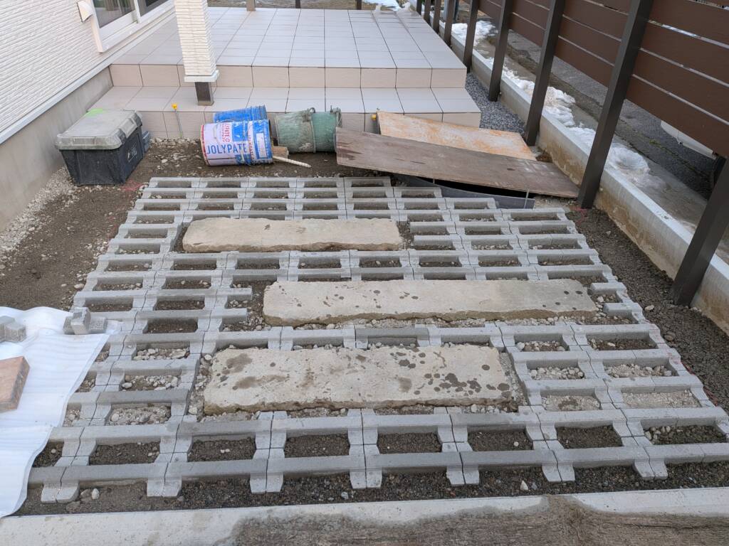タイルテラス下地、緑化ブロック 1/16(金) こちらの現場はタイルテラスの下地ブロック積みを行いました。まだ下地の段階なので仕上がりのイメージがつきにくいですが、向かて右側は階段状になり真ん中と左側では段差がついた仕上がりになっていきます。タイルの貼り代もあるので下地の寸法をよく確認しながら施工を行っています。 こちらの現場は既存タイルテラス前の駐車スペースに緑化ブロック、グラスハイブリックボーダーと切石を組み合わせた仕上げになります。空いた箇所には伊勢砂利を敷き詰めていきます。