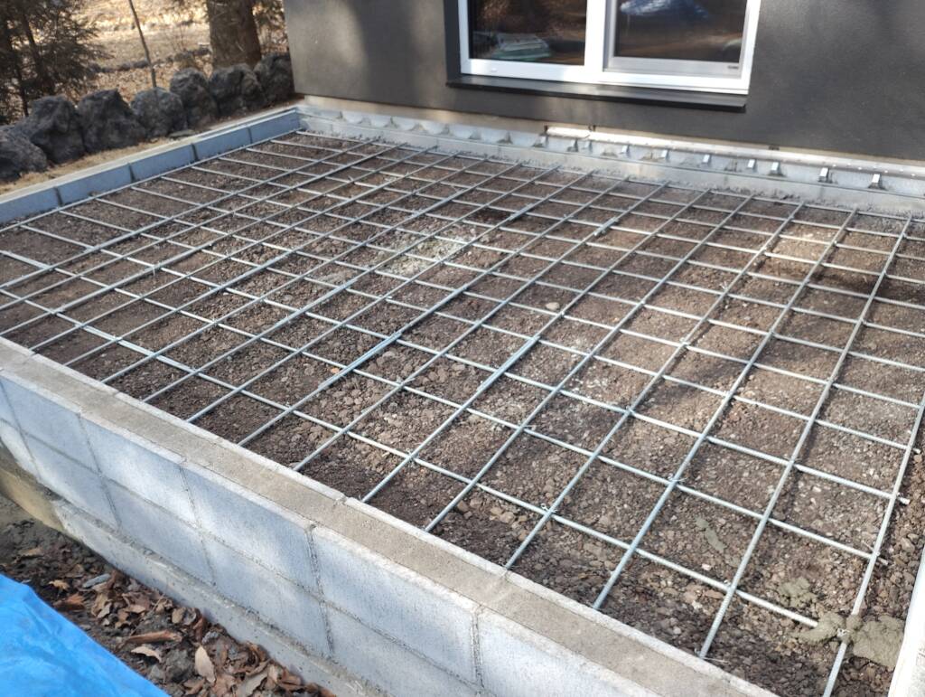 タイルテラスベース打設、配筋、乱張り目地入れ