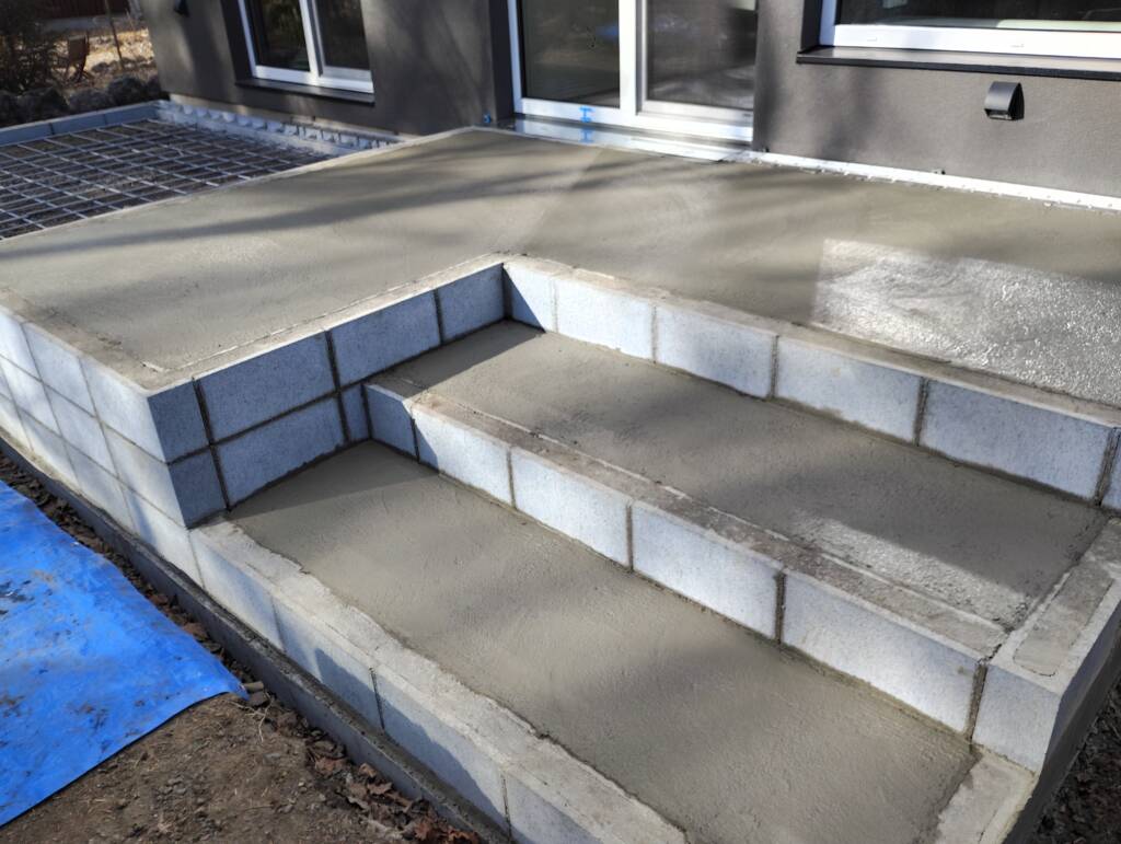 こちらの現場ではタイルテラスのベース打設、配筋を行いました。現場までの道幅が大型車両入らないため、人力打設となりました。一輪車にから練りコンクリートをあけ、鍬でらの現場ではタイルテラスのベース打設、配筋を行いました。現場までの道幅が大型車両入らないため、人力打設となりました。一輪車にから練りコンクリートをあけ、練り鍬で練り打設で施工しました。