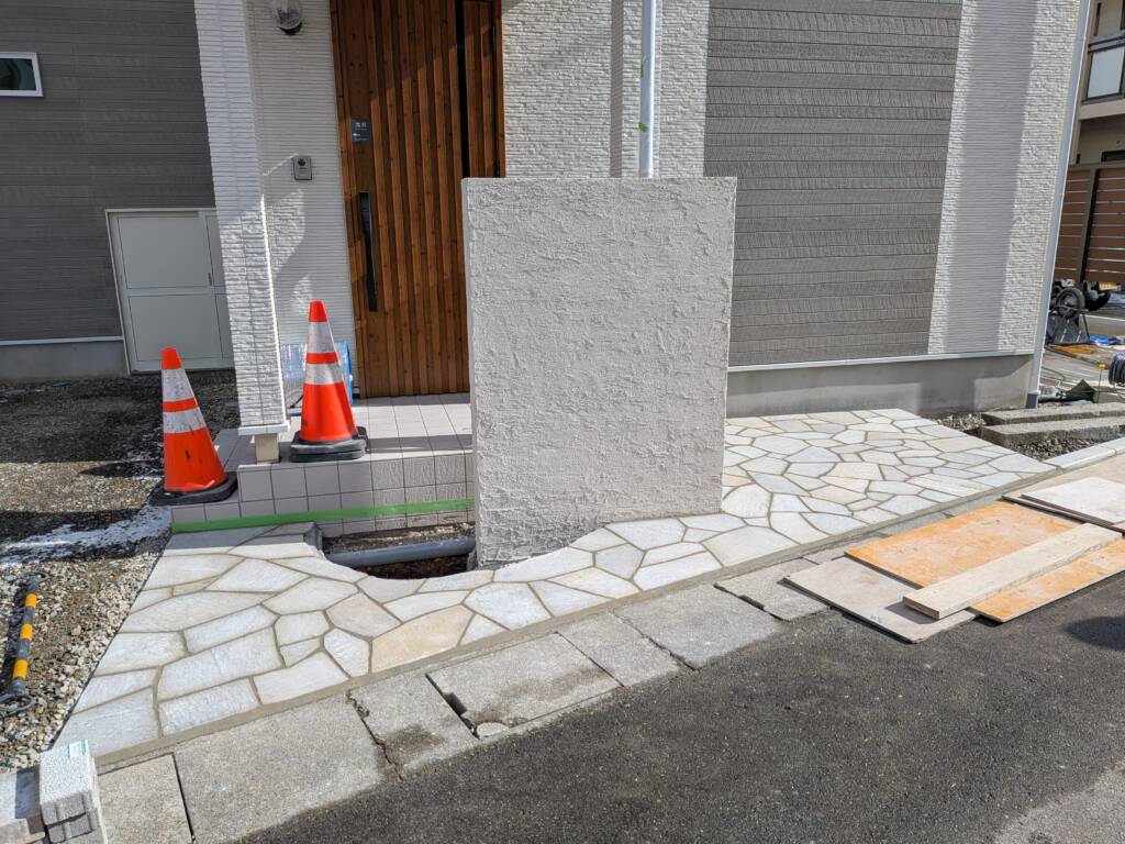 こちらの現場は天然石乱張りした目地入れを行いました。目地の色はグレーになります。