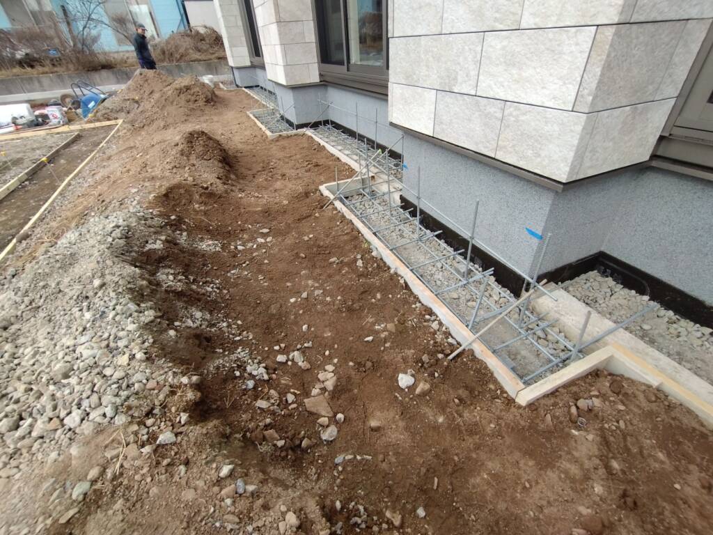 こちらの現場はタイルテラスの下地を行いました。タイルテラスの下地は外周回りにブロックを積んで中は土間を打設するようにしていきます。ブロックの下地はコンクリートを打設するので、先に配筋を行います。今回は直線でブロックを積めないので、ブロックの割り付けを考えながら、鉄筋を組んでいきます。