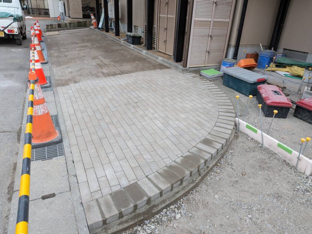 こちらの現場はインターロッキングの据え付けを行いました。インターロッキングの縁が曲線に仕上げになるため、端のインターロッキングを一つ一つ加工して据え付けいます。