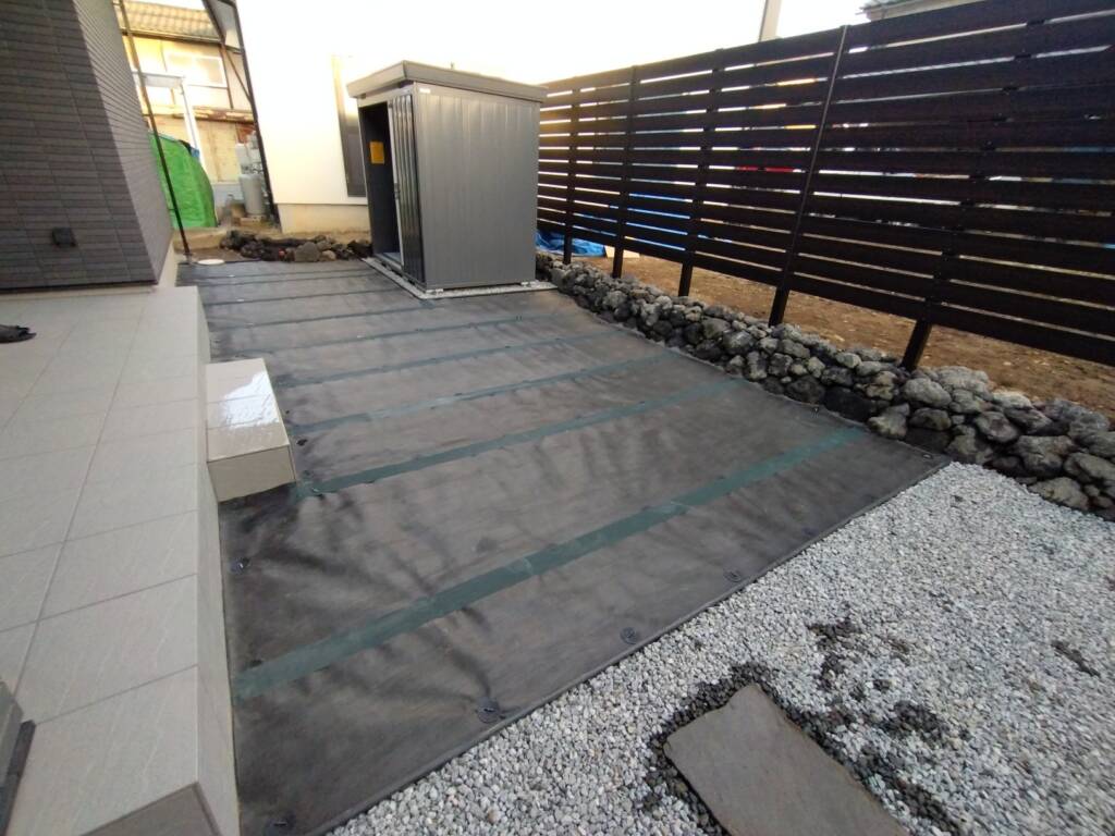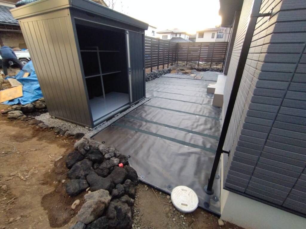 物置はイナバ物置フォルタを組み立て、設置しました。片開きは出し入れもしやすく、設置場所に合わせて扉の開き方向を変更することが出来ます。物置手前に敷いた防草シート箇所は人工芝を敷き込みますが、今回はお客様の方で施工するため、下地までになります。