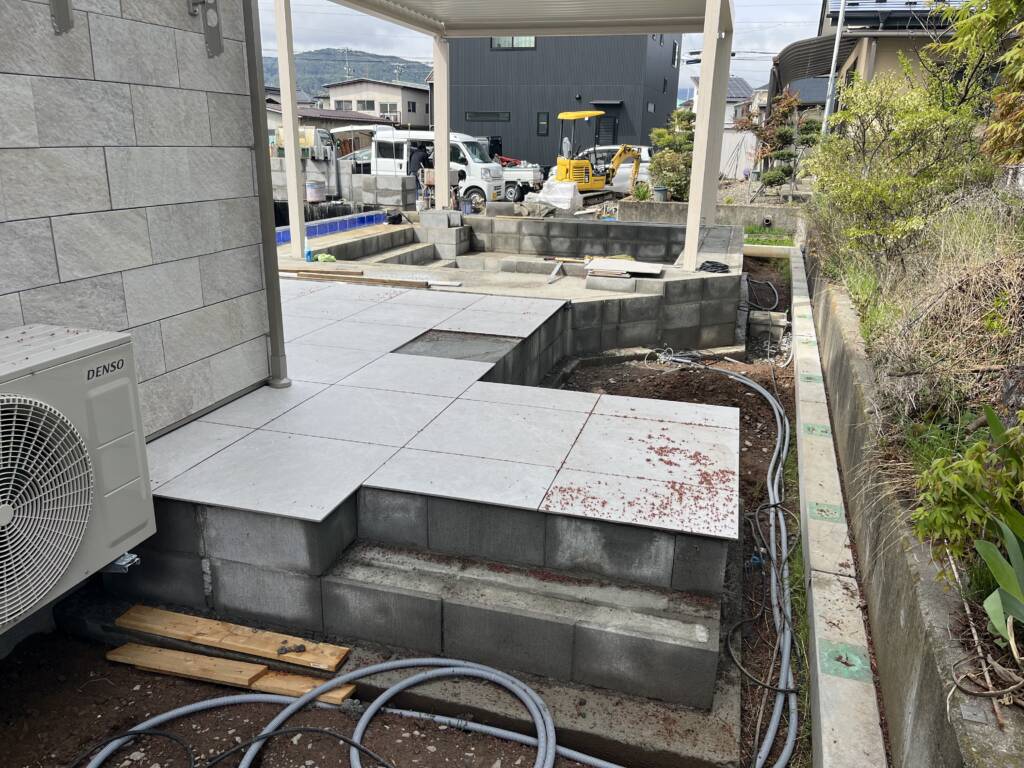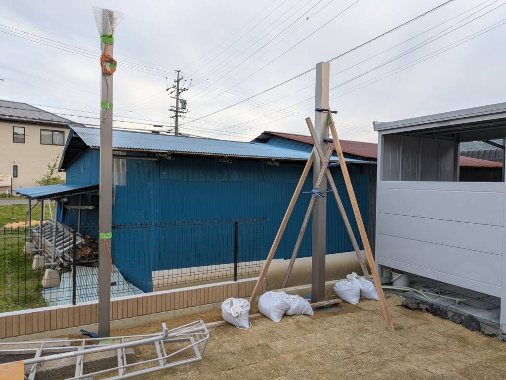 こちらの現場は昨日ハイポールスポットライト設置するに柱を建込した隣に防犯カメラを設置するために柱を建込を行いました。根元は昨日と同様でコンクリートで硬め、サポート柱で垂直に保持をさせています。こちらの現場はライト配線、水盤の滝口下地ブロック積を行いました。