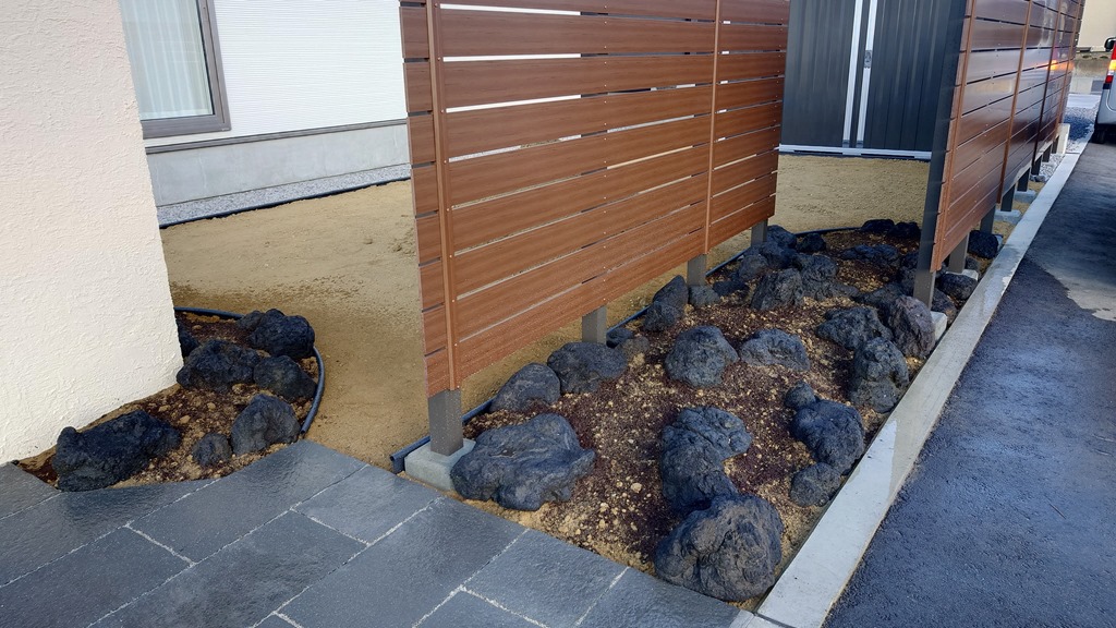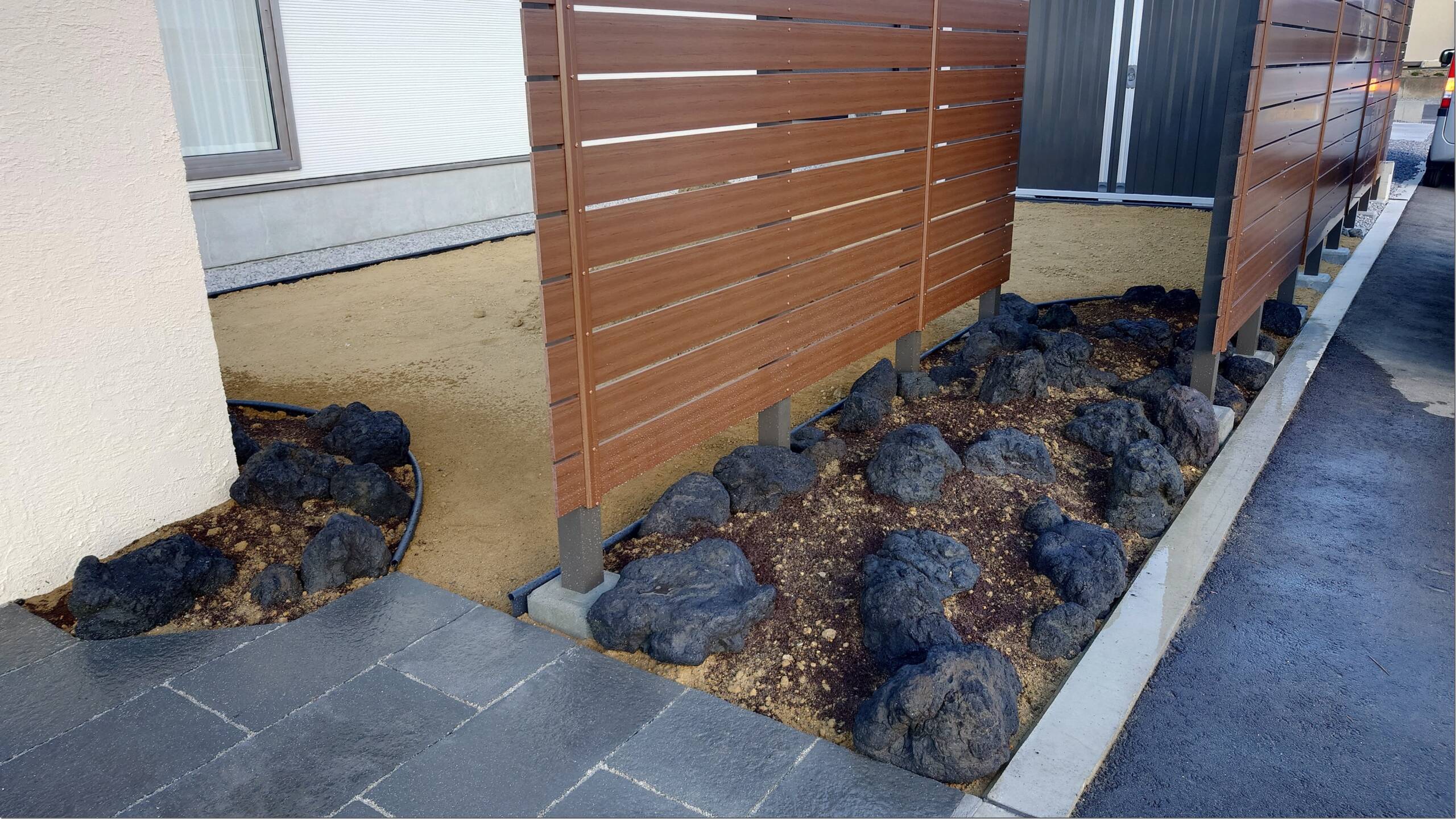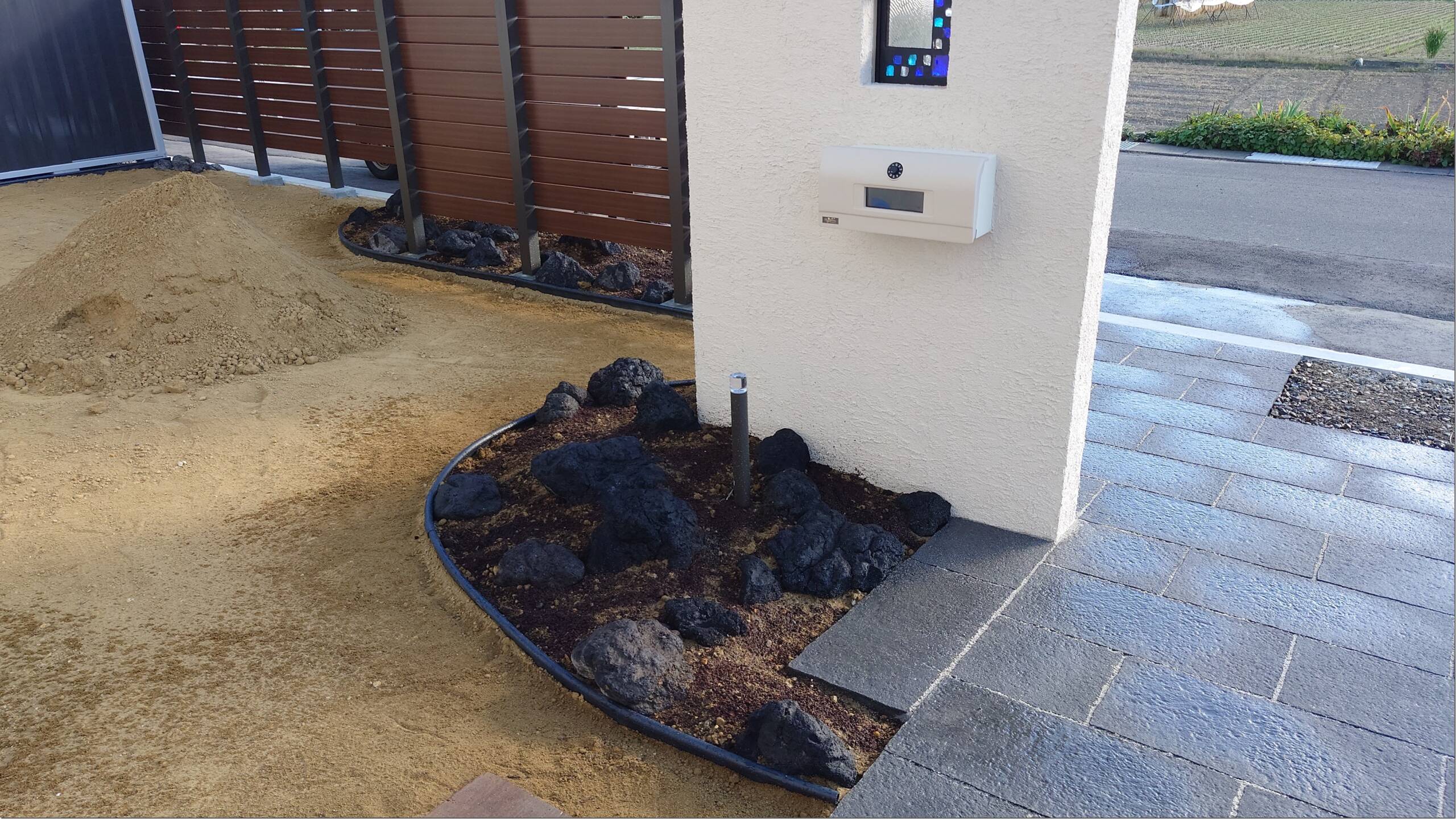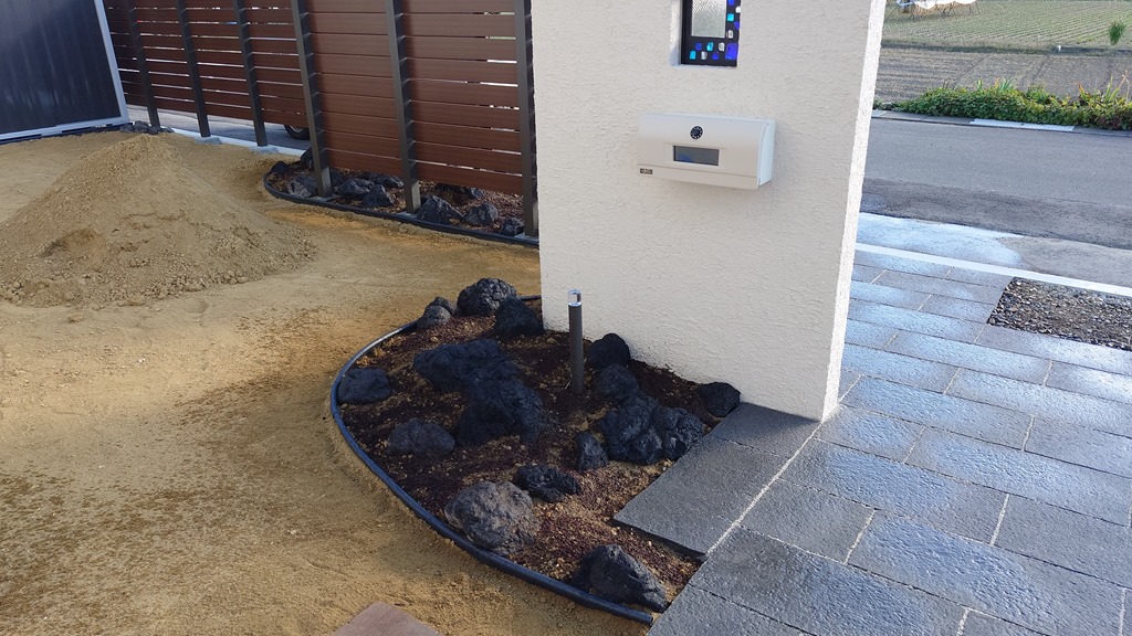 ABフェンス柱立てと花壇ベース。石貼り加工。アルモ建て込み。