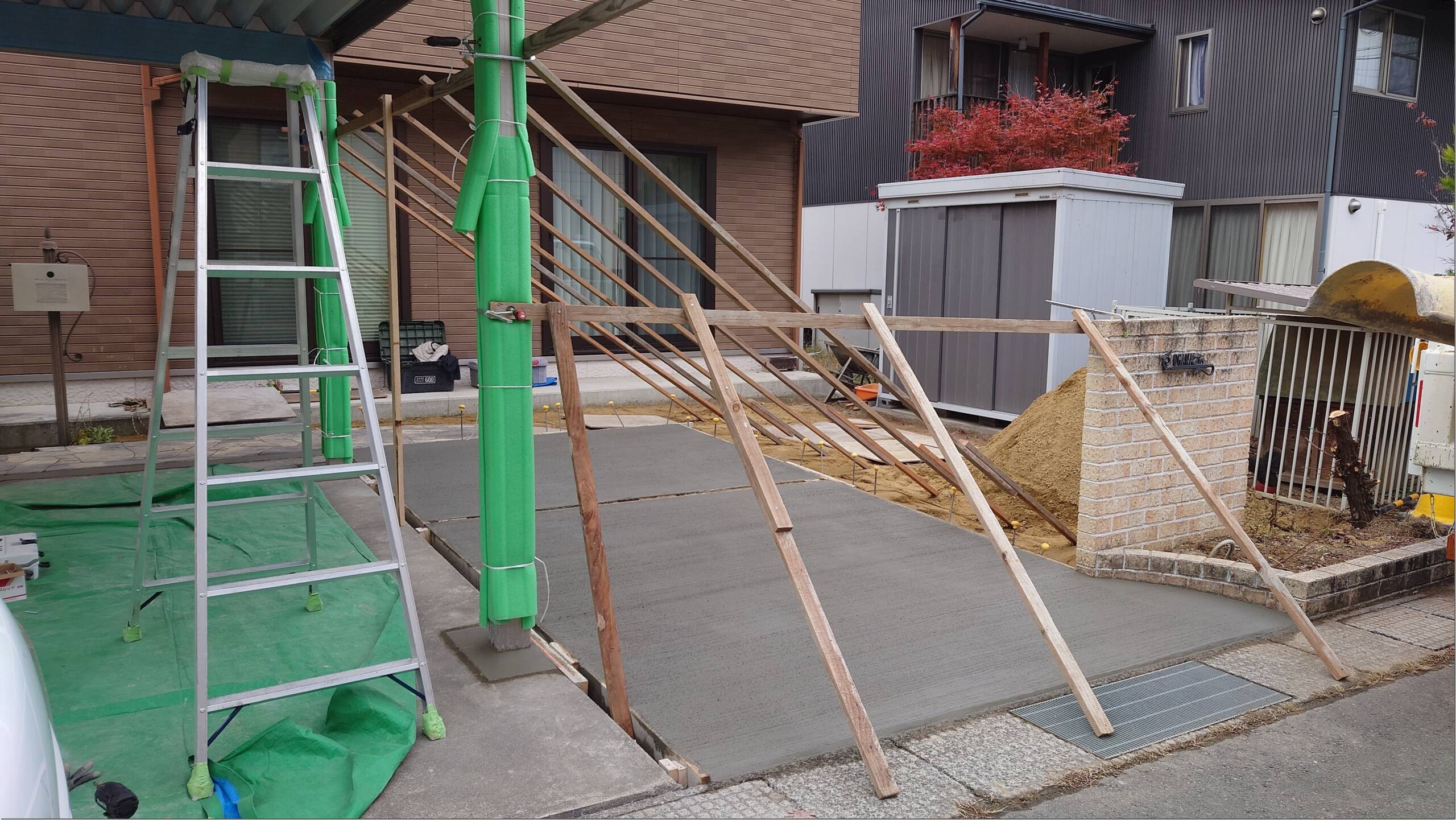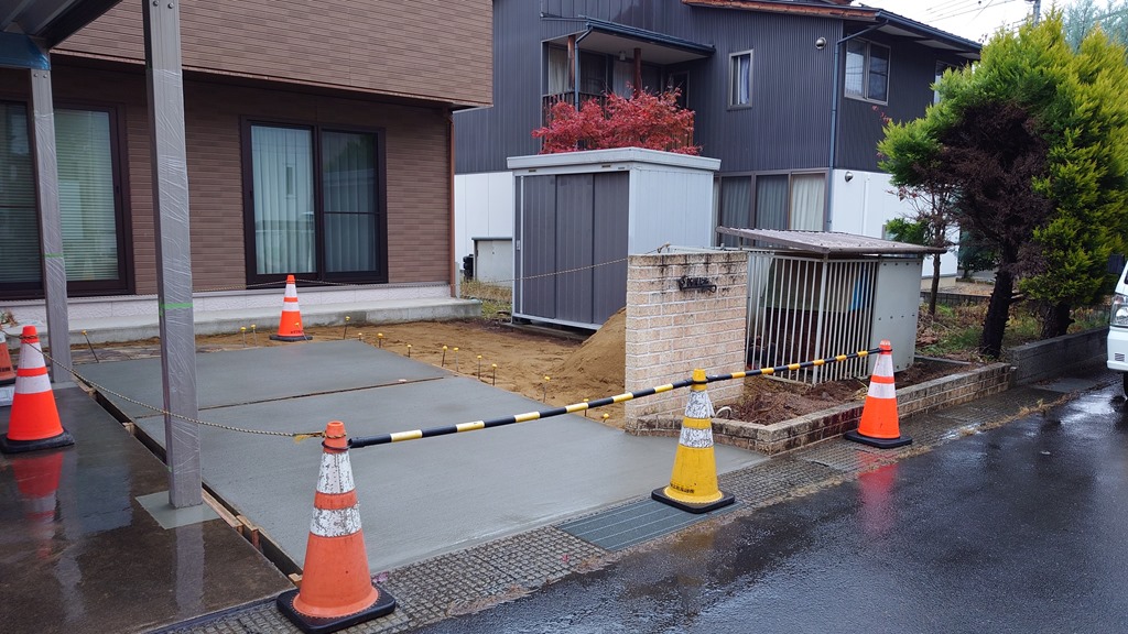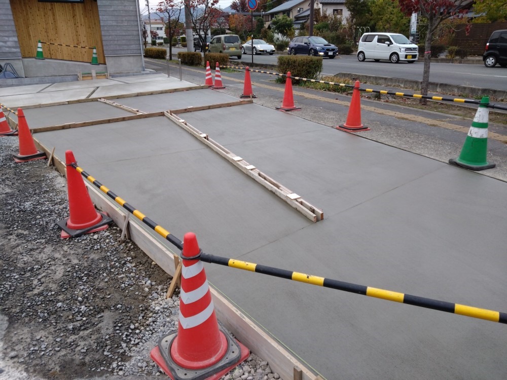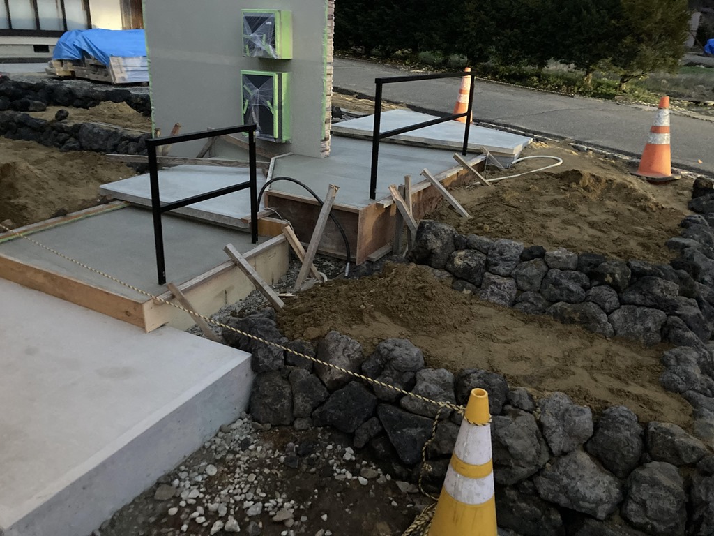 2件目の現場では玄関へ続くアプローチのコンクリート打設をしました。スリップ防止の刷毛引きで仕上げました。こちらも午後1に打設しましたが乾燥も早く短時間で施工出来ました。