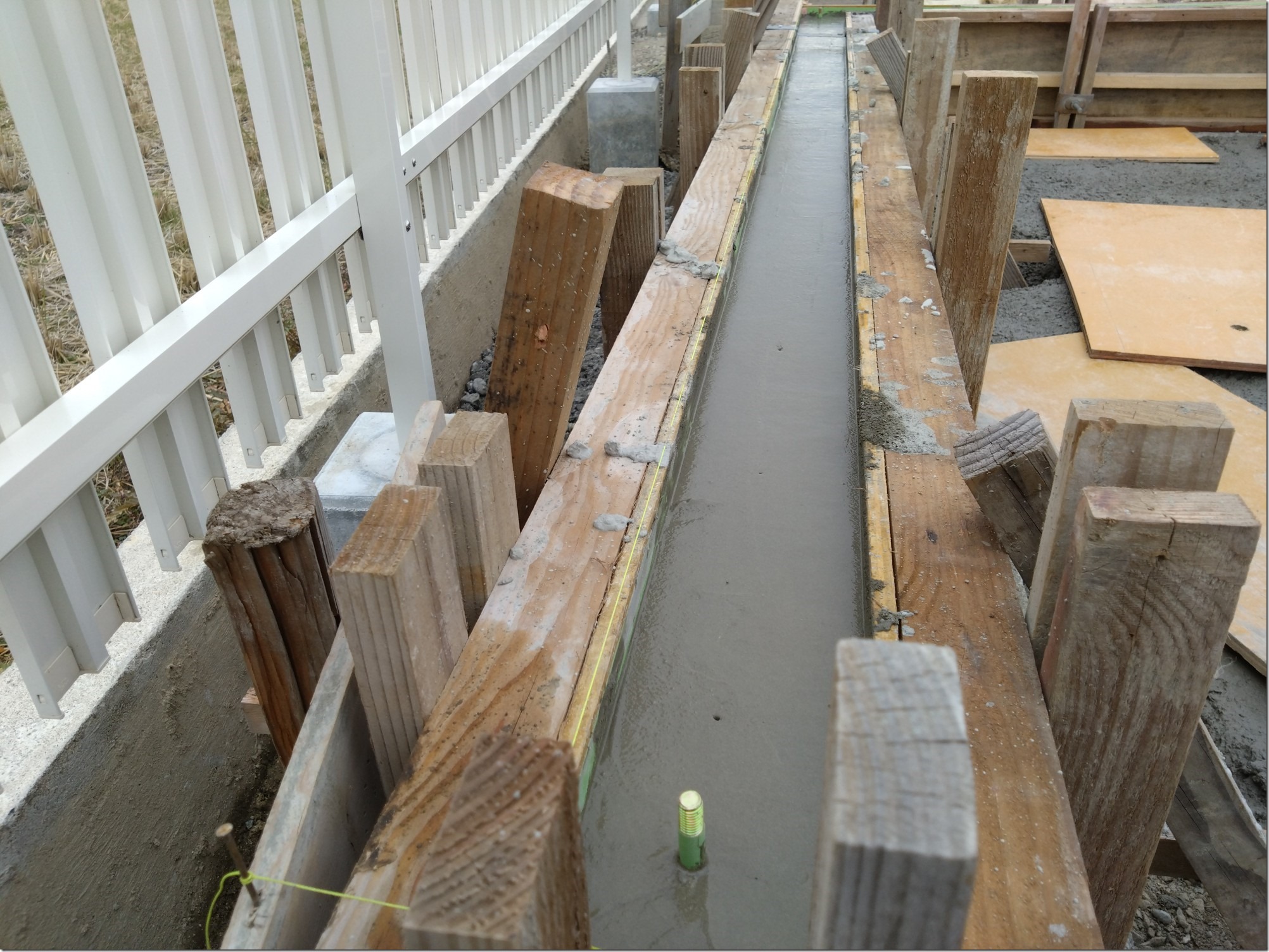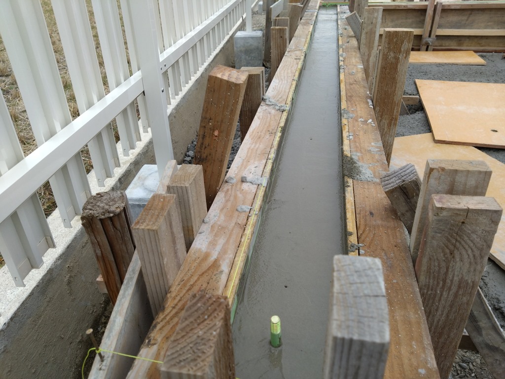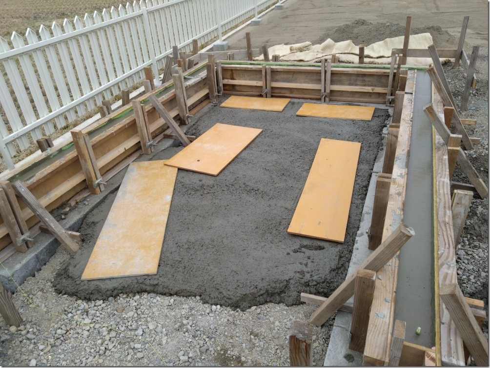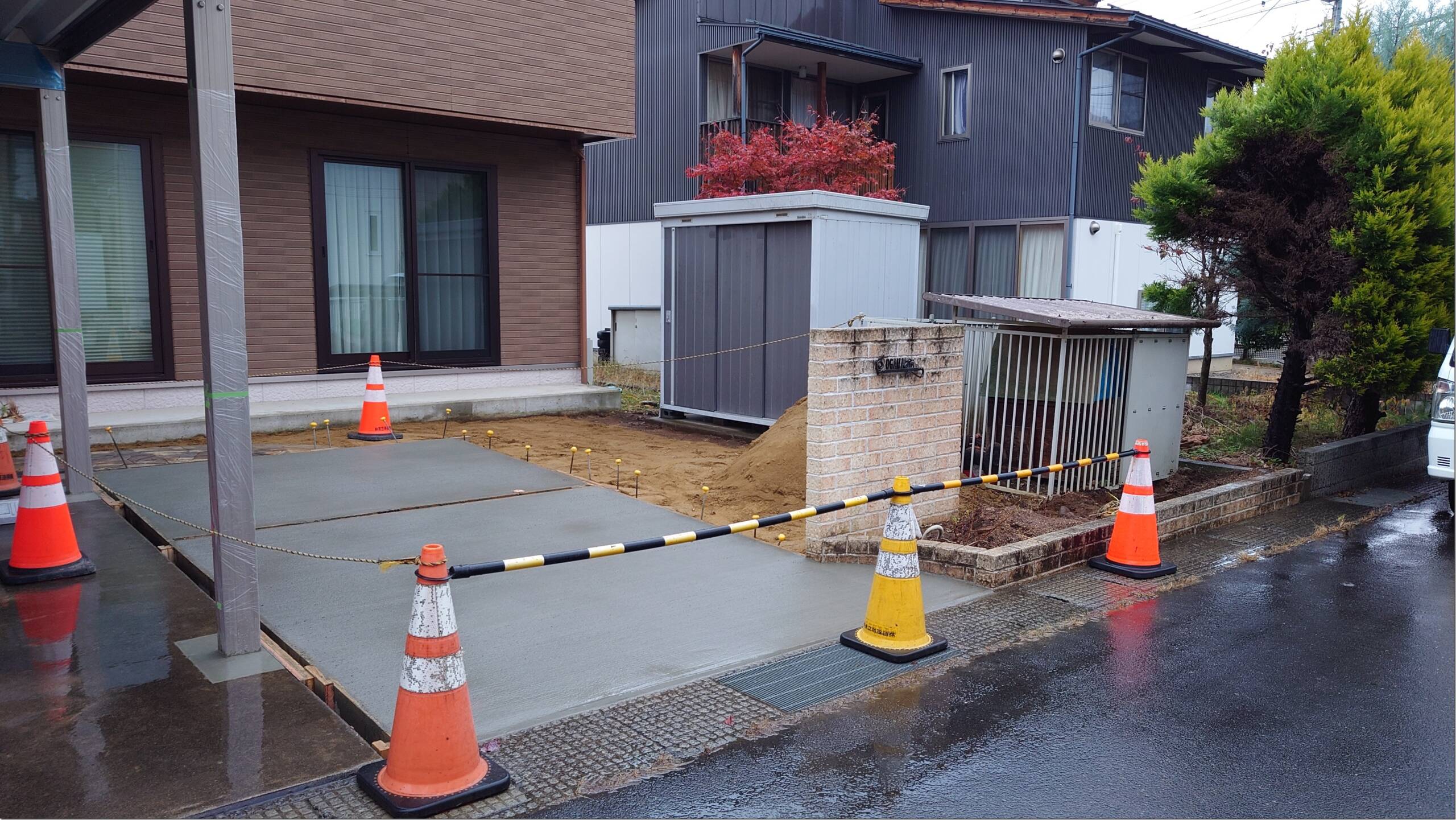 2件目の現場では玄関へ続くアプローチのコンクリート打設をしました。スリップ防止の刷毛引きで仕上げました。こちらも午後1に打設しましたが乾燥も早く短時間で施工出来ました。