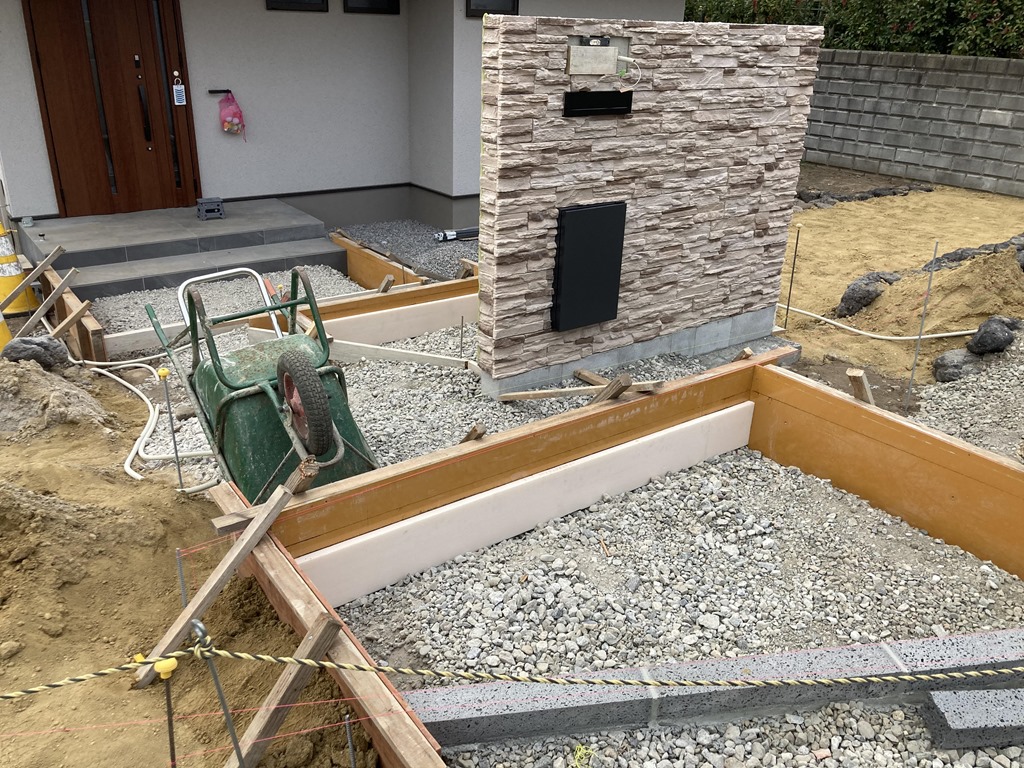 3件目の現場でも玄関周りの工事を進めています。門柱の凹凸を平らにするため下地処理材を使い整形していきます。この作業が非常に大切になります。門柱の足元には石貼りをするためのベースコンクリートを打設しました。この上へ天然石を張っていきます。来週も暑い日が続きますが各現場でこまめな休憩と水分補給をして安全に作業を進めていきたいと思います。