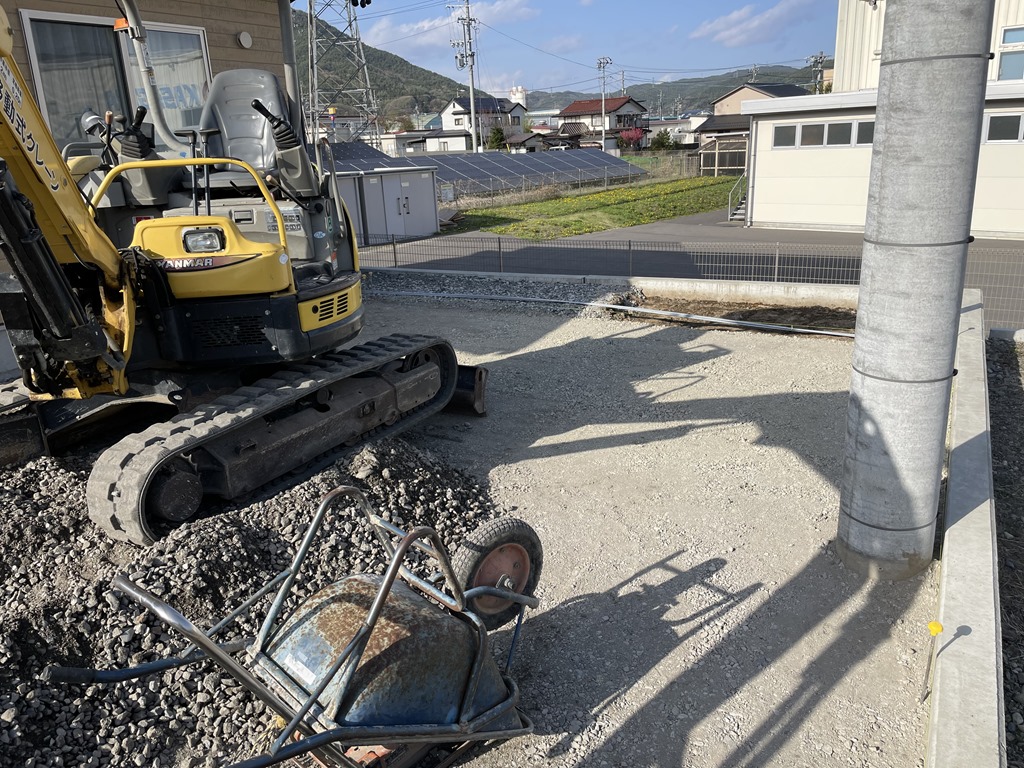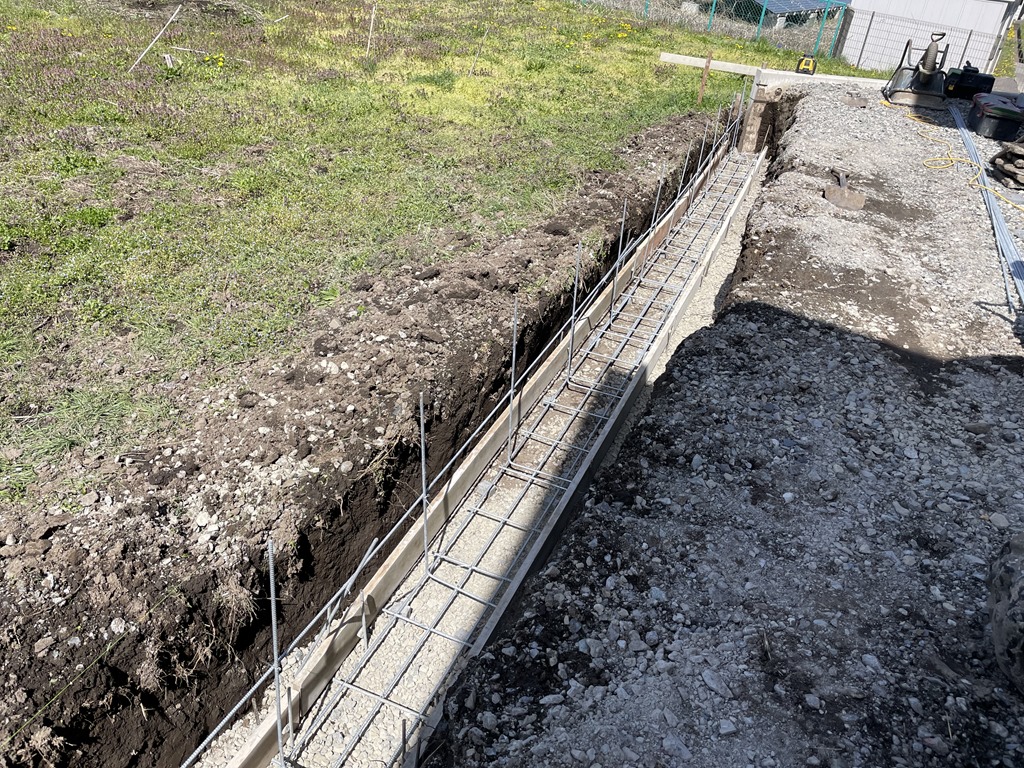 放射冷却により朝は凄く冷え込みましたが日中は暖かく作業しやすい日でした。現場作業も予定以上に捗りました。昨日打設したタイルテラスのベースコンクリートの脱型をし、余分なバリを取り除き清掃しました。同現場で敷地の周りにはリクシルのABフェンスys3型を取り付けるため柱を建て込みました。テラス腰壁の正面には花壇を作るのでブロックのベースコンクリートを打設していきます。