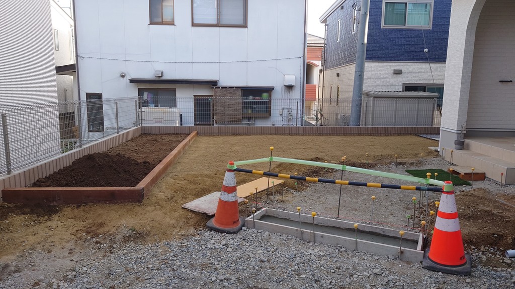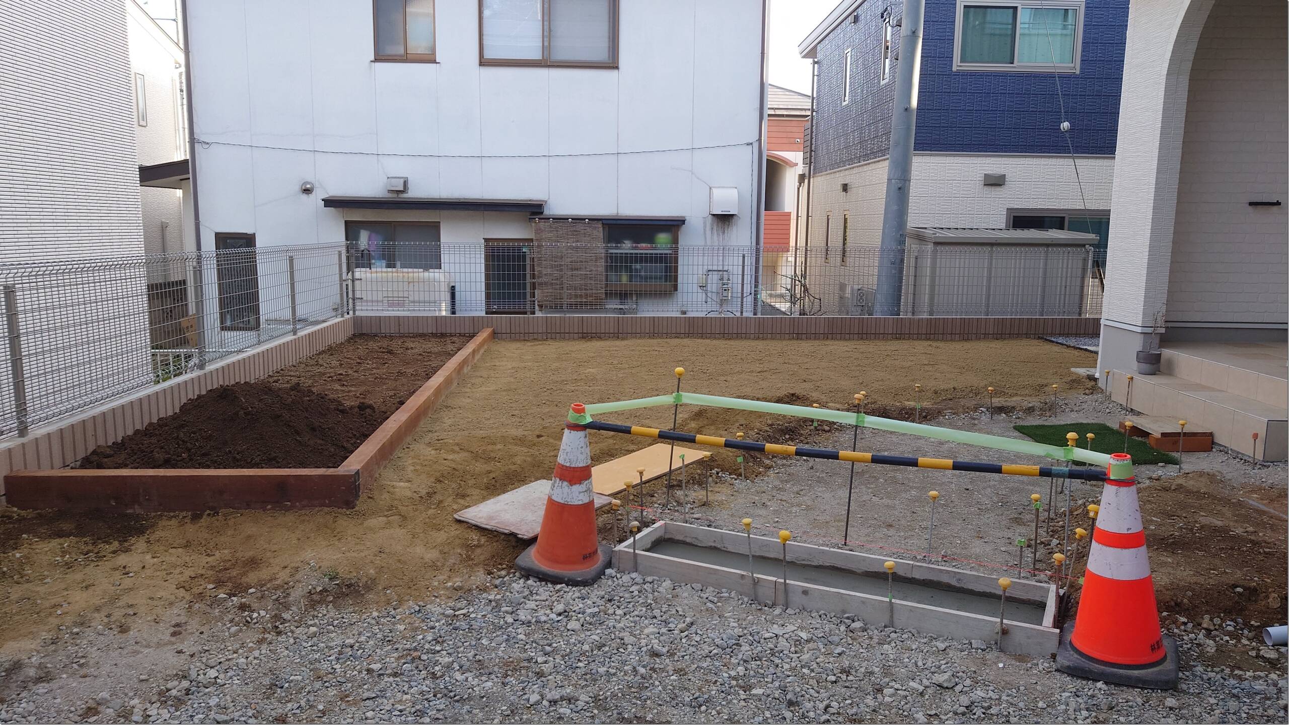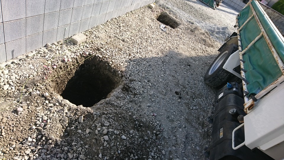 3件目の現場ではブロックのベースコンクリートの準備をしているところです。今日はスキ土した箇所に砕石を入れ転圧をしました。並行して既存ブロック塀を解体しました。