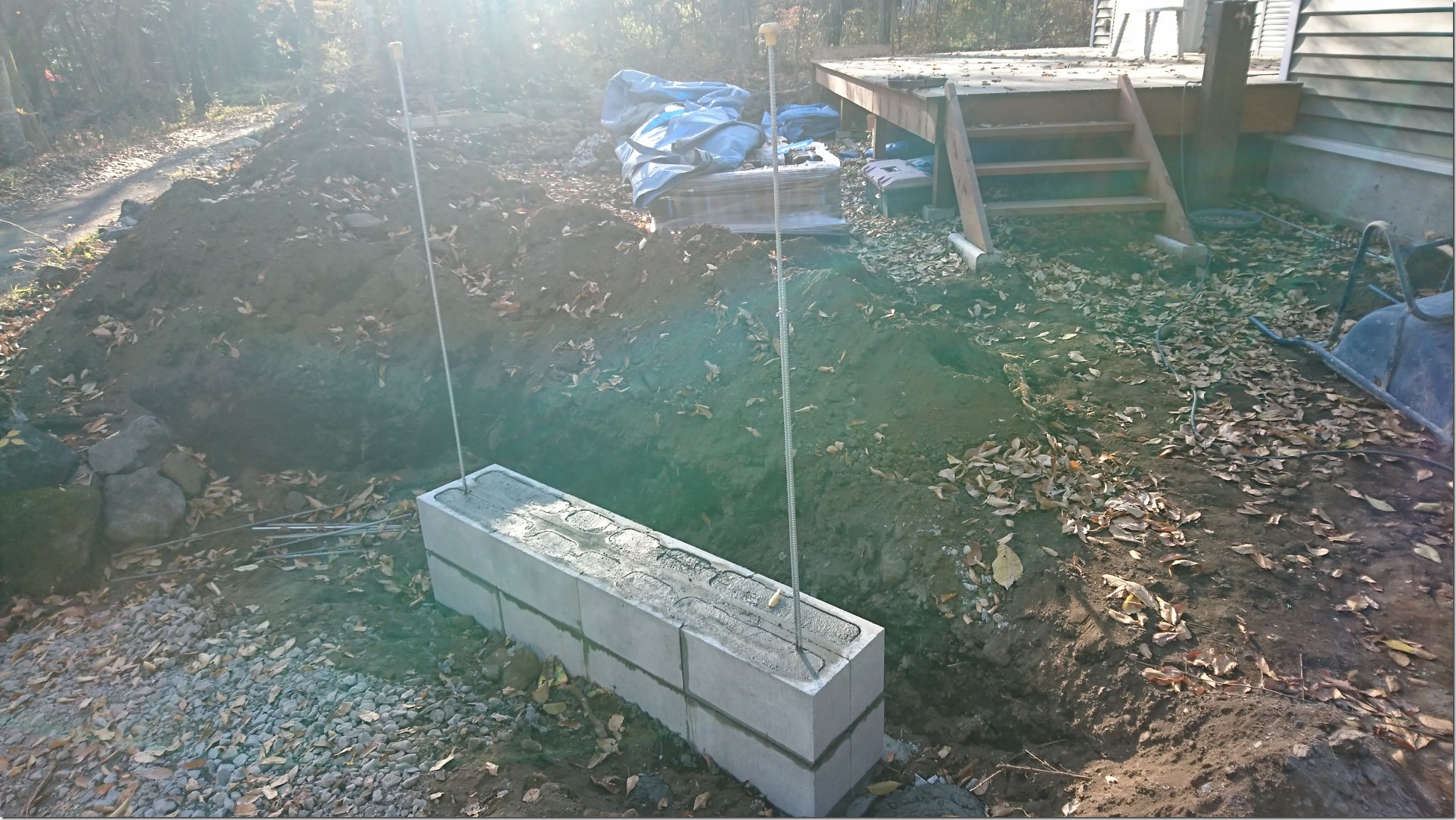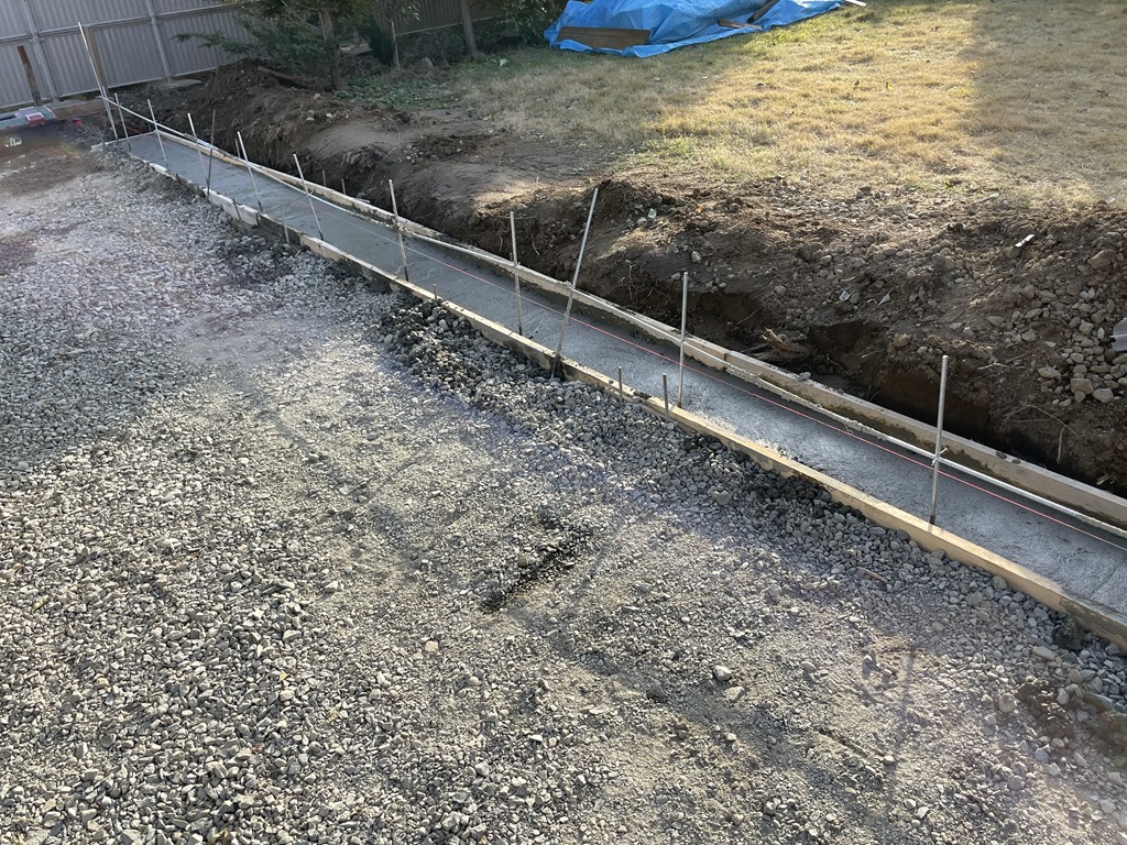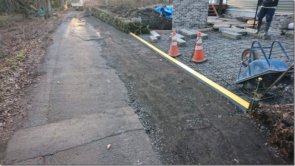 その後も天気がもってくれたのでガレージ外のスキ土を行っていきました。道路際が少し深くしているのはリビオ[ai]緑化80を据えていくためです。沈下が起きないようベースコンクリートを打設します。