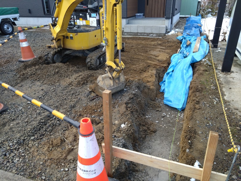 本日も駐車場スペースのスキ土及び砕石路盤の造成工事をしました。現場は塩尻方面になるのですが、北部と違い積雪はありませんでしたがとにかく風が強いです。雪は積もらずに突風で舞っていました。砕石の山なども凍みていました。そんな現場状況でしたが作業の方は順調に進み、5号砕石と山砂の仕切り材のフチオモイも設置し決まりをつけていきます。