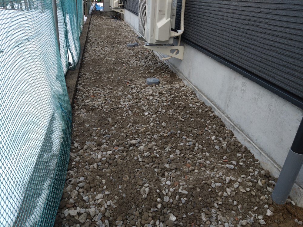 こちらの現場では、ブロックのベース打設とスキ土、砕石搬入作業を行いました。寒い日に生コンを扱う際は凍結防止のため防凍材を使用していきます。今回使用するブロックは化粧ブロックのスクエアⅭという商品で色はダークグレーになります。建物の横にはスマートエッジという縁石を据えていきます。