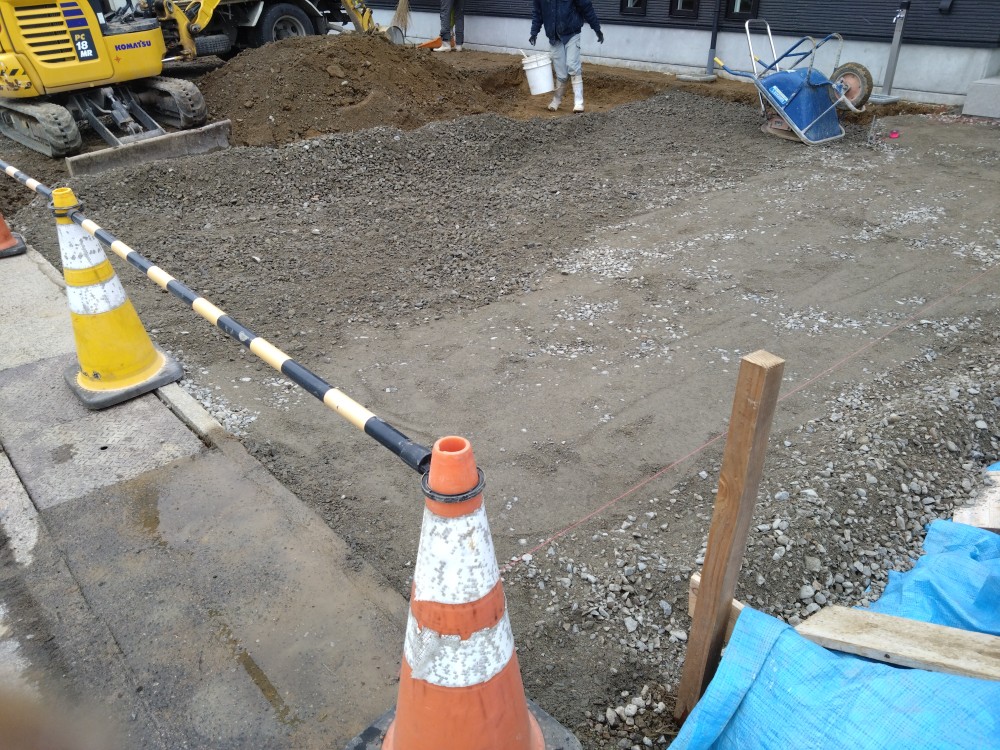 化粧ブロック ベース下地 10月2日(木) 今日は、こちらの現場でブロックのベース下地と、積み終わっていなかった部分のブロック積みを行いました。一枚目の写真の奥に積んであるブロックの続きで施工していきます。境界の基礎がだんだん上がっていっているため、今回打つ部分はブロック一つ分上げてベースを打設します。見ての通り作業スペースが狭いので、鉄筋の運び入れや配筋の際には、壁や室外機に接触のないよう慎重に作業しました。打設、ブロック積みなども控えているので、道具の振り回しや体の動かし方を気にしつつ仕上げていきます。