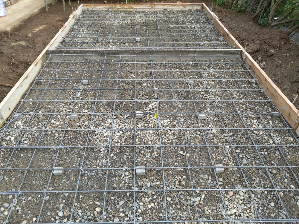 土間下地 9月18日(木) 敷地内の既存樹木を伐採抜根を行い、車両1台分の土間コン駐車場を施工中。鉄筋間隔は20センチピッチで結束し、コンクリートサイコロを1㎡当たり4個設置し、5センチ程浮かし生コンのかぶり厚を確保。土間中間には、コンクリートの伸縮に優れ順応性を持っているスーパー目地を設置。生コン打設の準備が整い、打設となります。 長野市 松本市 塩尻市 外構エクステリア